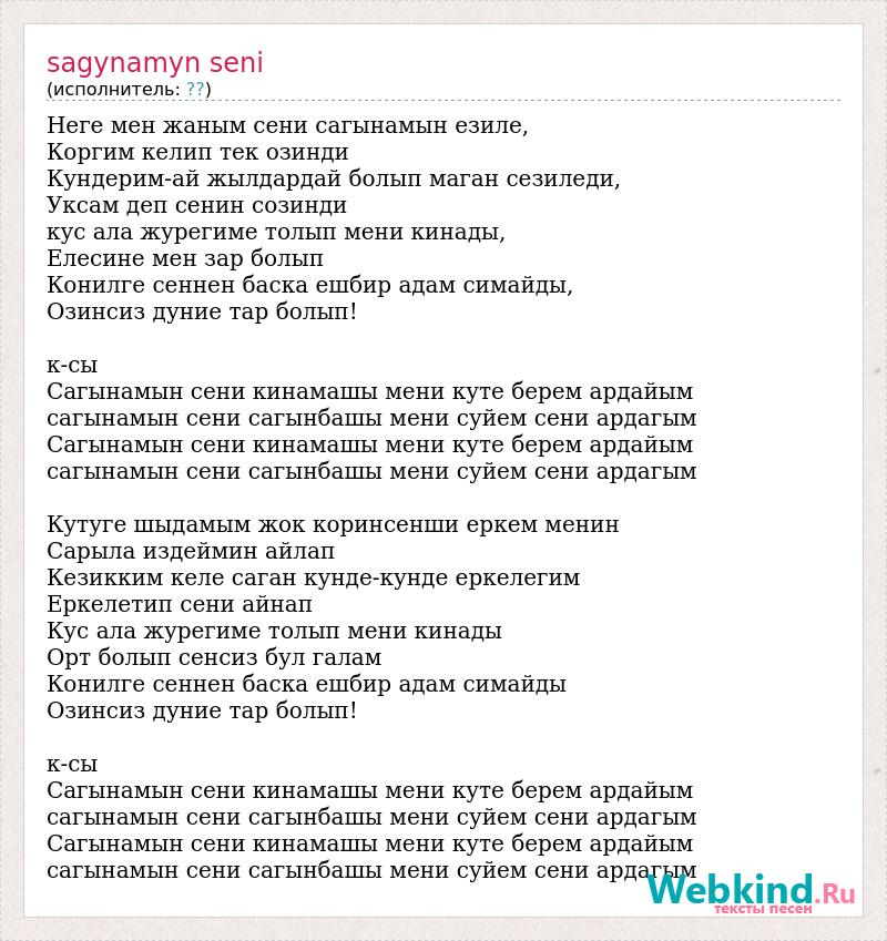 Неге мен жаным сени сагынамын езиле, Коргим келип тек озинди Кундерим-ай жылдардай болып маган сезиледи, Уксам деп сенин созинди кус ала журегиме толып мени кинады, Елесине мен зар болып Конилге сеннен баска ешбир адам симайды, Озинсиз дуние тар болып! к-сы Сагынамын сени кинамашы мени куте берем ардайым сагынамын сени сагынбашы мени суйем сени ардагым Сагынамын сени кинамашы мени куте берем ардайым сагынамын сени сагынбашы мени суйем сени ардагым Кутуге шыдамым жок коринсенши еркем менин Сарыла издеймин айлап Кезикким келе саган кунде-кунде еркелегим Еркелетип сени айнап Кус ала журегиме толып мени кинады Орт болып сенсиз бул галам Конилге сеннен баска ешбир адам симайды Озинсиз дуние тар болып! к-сы Сагынамын сени кинамашы мени куте берем ардайым сагынамын сени сагынбашы мени суйем сени ардагым Сагынамын сени кинамашы мени куте берем ардайым сагынамын сени сагынбашы мени суйем сени ардагым