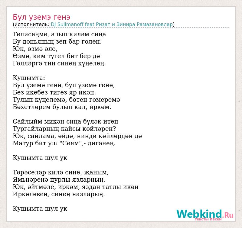 Телисеңме, алып киләм сиңа Бу дөньяның зеп бар гөлен. Юк, өзмә әле, Өзмә, ким түгел бит бер дә Гөлләргә тиң синең күңелең. Кушымта: Бул үземә генә, бул үземә генә, Без икебез тигез яр икән. Тулып күңелемә, бөтен гомеремә Бәхетләрем булып кал, иркәм. Сайлыйм микән сиңа бүләк итеп Тургайларның кайсы көйләрен? Юк, сайлама, әйдә, нинди көйләрдән дә Матур бит ул: "Сөям",- дигәнең. Кушымта шул ук Төрәселәр килә сине, җаным, Ямьнәренә нурлы язларның. Юк, әйтмәле, иркәм, яздан татлы икән Иркәләвең, синең назларың. Кушымта шул ук