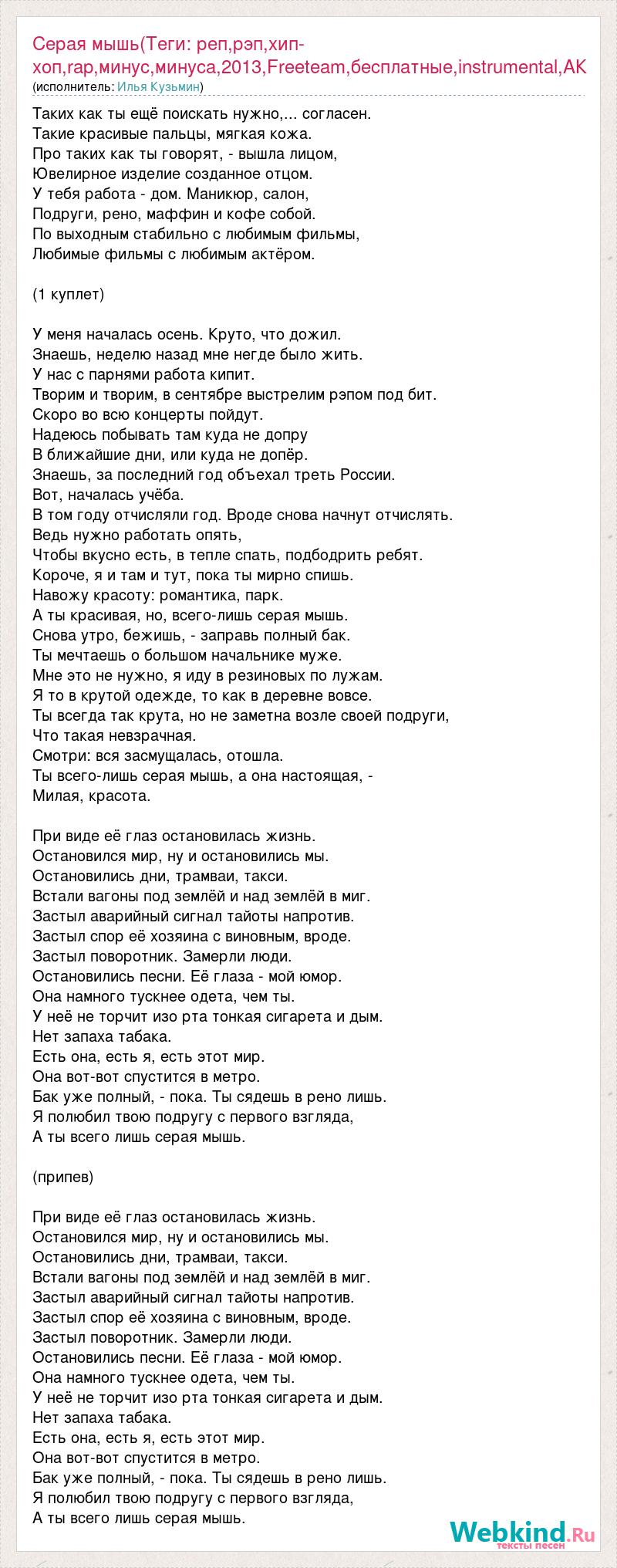 Таких как ты ещё поискать нужно,... согласен. Такие красивые пальцы, мягкая кожа. Про таких как ты говорят, - вышла лицом, Ювелирное изделие созданное отцом. У тебя работа - дом. Маникюр, салон, Подруги, рено, маффин и кофе собой. По выходным стабильно с любимым фильмы, Любимые фильмы с любимым актёром. (1 куплет) У меня началась осень. Круто, что дожил. Знаешь, неделю назад мне негде было жить. У нас с парнями работа кипит. Творим и творим, в сентябре выстрелим рэпом под бит. Скоро во всю концерты пойдут. Надеюсь побывать там куда не допру В ближайшие дни, или куда не допёр. Знаешь, за последний год объехал треть России. Вот, началась учёба. В том году отчисляли год. Вроде снова начнут отчислять. Ведь нужно работать опять, Чтобы вкусно есть, в тепле спать, подбодрить ребят. Короче, я и там и тут, пока ты мирно спишь. Навожу красоту: романтика, парк. А ты красивая, но, всего-лишь серая мышь. Снова утро, бежишь, - заправь полный бак. Ты мечтаешь о большом начальнике муже. Мне это не нужно, я иду в резиновых по лужам. Я то в крутой одежде, то как в деревне вовсе. Ты всегда так крута, но не заметна возле своей подруги, Что такая невзрачная. Смотри: вся засмущалась, отошла. Ты всего-лишь серая мышь, а она настоящая, - Милая, красота. При виде её глаз остановилась жизнь. Остановился мир, ну и остановились мы. Остановились дни, трамваи, такси. Встали вагоны под землёй и над землёй в миг. Застыл аварийный сигнал тайоты напротив. Застыл спор её хозяина с виновным, вроде. Застыл поворотник. Замерли люди. Остановились песни. Её глаза - мой юмор. Она намного тускнее одета, чем ты. У неё не торчит изо рта тонкая сигарета и дым. Нет запаха табака. Есть она, есть я, есть этот мир. Она вот-вот спустится в метро. Бак уже полный, - пока. Ты сядешь в рено лишь. Я полюбил твою подругу с первого взгляда, А ты всего лишь серая мышь. (припев) При виде её глаз остановилась жизнь. Остановился мир, ну и остановились мы. Остановились дни, трамваи, такси. Встали вагоны под землёй и над землёй в миг. Застыл аварийный сигнал тайоты напротив. Застыл спор её хозяина с виновным, вроде. Застыл поворотник. Замерли люди. Остановились песни. Её глаза - мой юмор. Она намного тускнее одета, чем ты. У неё не торчит изо рта тонкая сигарета и дым. Нет запаха табака. Есть она, есть я, есть этот мир. Она вот-вот спустится в метро. Бак уже полный, - пока. Ты сядешь в рено лишь. Я полюбил твою подругу с первого взгляда, А ты всего лишь серая мышь.