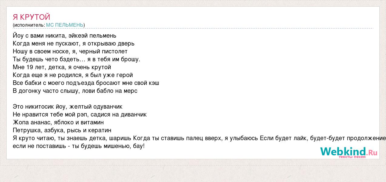 Йоу с вами никита, эйкеэй пельмень Когда меня не пускают, я открываю дверь Ношу в своем носке, я, черный пистолет Ты будешь чето бздеть… я в тебя им брошу. Мне 19 лет, детка, я очень крутой Когда еще я не родился, я был уже герой Все бабки с моего подъезда бросают мне свой кэш В догонку часто слышу, лови бабло на мерс Это никитосик йоу, желтый одуванчик Не нравится тебе мой рэп, садися на диванчик Жопа ананас, яблоко и витамин Петрушка, азбука, рысь и кератин Я круто читаю, ты знаешь детка, шаришь Когда ты ставишь палец вверх, я улыбаюсь Если будет лайк, будет-будет продолжение если не поставишь - ты будешь мишенью, бау!