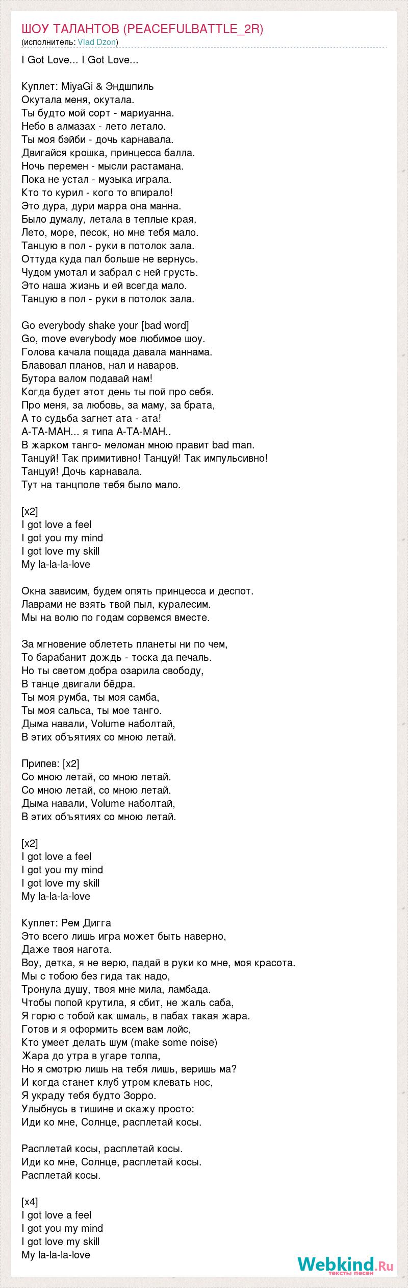 I Got Love... I Got Love... Куплет: MiyaGi & Эндшпиль Окутала меня, окутала. Ты будто мой сорт - мариуанна. Небо в алмазах - лето летало. Ты моя бэйби - дочь карнавала. Двигайся крошка, принцесса балла. Ночь перемен - мысли растамана. Пока не устал - музыка играла. Кто то курил - кого то впирало! Это дура, дури марра она манна. Было думалу, летала в теплые края. Лето, море, песок, но мне тебя мало. Танцую в пол - руки в потолок зала. Оттуда куда пал больше не вернусь. Чудом умотал и забрал с ней грусть. Это наша жизнь и ей всегда мало. Танцую в пол - руки в потолок зала. Go everybody shake your [bad word] Go, move everybody мое любимое шоу. Голова качала пощада давала маннама. Блавовал планов, нал и наваров. Бутора валом подавай нам! Когда будет этот день ты пой про себя. Про меня, за любовь, за маму, за брата, А то судьба загнет ата - ата! А-ТА-МАН... я типа А-ТА-МАН.. В жарком танго- меломан мною правит bad man. Танцуй! Так примитивно! Танцуй! Так импульсивно! Танцуй! Дочь карнавала. Тут на танцполе тебя было мало. [x2] I got love a feel I got you my mind I got love my skill My la-la-la-love Окна зависим, будем опять принцесса и деспот. Лаврами не взять твой пыл, куралесим. Мы на волю по годам сорвемся вместе. За мгновение облететь планеты ни по чем, То барабанит дождь - тоска да печаль. Но ты светом добра озарила свободу, В танце двигали бёдра. Ты моя румба, ты моя самба, Ты моя сальса, ты мое танго. Дыма навали, Volume наболтай, В этих объятиях со мною летай. Припев: [х2] Со мною летай, со мною летай. Со мною летай, со мною летай. Дыма навали, Volume наболтай, В этих объятиях со мною летай. [х2] I got love a feel I got you my mind I got love my skill My la-la-la-love Куплет: Рем Дигга Это всего лишь игра может быть наверно, Даже твоя нагота. Воу, детка, я не верю, падай в руки ко мне, моя красота. Мы с тобою без гида так надо, Тронула душу, твоя мне мила, ламбада. Чтобы попой крутила, я сбит, не жаль саба, Я горю с тобой как шмаль, в пабах такая жара. Готов и я оформить всем вам лойс, Кто умеет делать шум (make some noise) Жара до утра в угаре толпа, Но я смотрю лишь на тебя лишь, веришь ма? И когда станет клуб утром клевать нос, Я украду тебя будто Зорро. Улыбнусь в тишине и скажу просто: Иди ко мне, Солнце, расплетай косы. Расплетай косы, расплетай косы. Иди ко мне, Солнце, расплетай косы. Расплетай косы. [x4] I got love a feel I got you my mind I got love my skill My la-la-la-love
