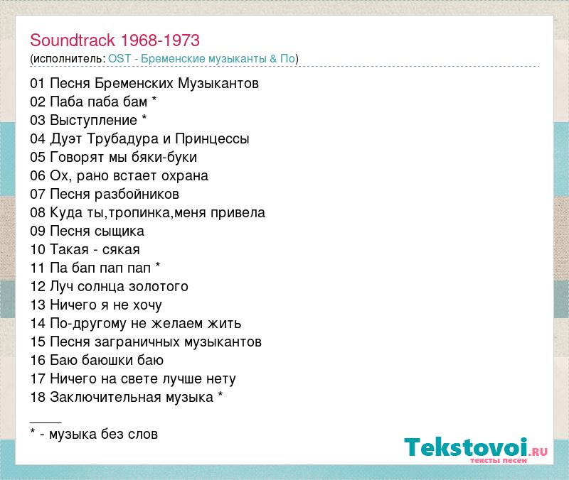01 Песня Бременских Музыкантов 02 Паба паба бам * 03 Выступление * 04 Дуэт Трубадура и Принцессы 05 Говорят мы бяки-буки 06 Ох, рано встает охрана 07 Песня разбойников 08 Куда ты,тропинка,меня привела 09 Песня сыщика 10 Такая - сякая 11 Па бап пап пап * 12 Луч солнца золотого 13 Ничего я не хочу 14 По-другому не желаем жить 15 Песня заграничных музыкантов 16 Баю баюшки баю 17 Ничего на свете лучше нету 18 Заключительная музыка * ____ * - музыка без слов