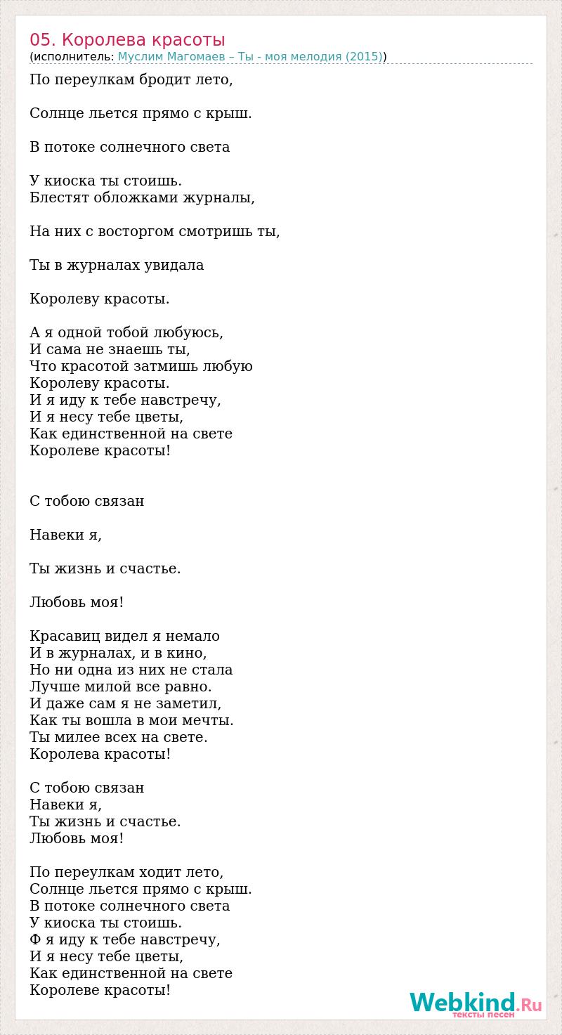 По переулкам бродит лето, Солнце льется прямо с крыш. В потоке солнечного света У киоска ты стоишь. Блестят обложками журналы, На них с восторгом смотришь ты, Ты в журналах увидала Королеву красоты. А я одной тобой любуюсь, И сама не знаешь ты, Что красотой затмишь любую Королеву красоты. И я иду к тебе навстречу, И я несу тебе цветы, Как единственной на свете Королеве красоты! С тобою связан Навеки я, Ты жизнь и счастье. Любовь моя! Красавиц видел я немало И в журналах, и в кино, Но ни одна из них не стала Лучше милой все равно. И даже сам я не заметил, Как ты вошла в мои мечты. Ты милее всех на свете. Королева красоты! С тобою связан Навеки я, Ты жизнь и счастье. Любовь моя! По переулкам ходит лето, Солнце льется прямо с крыш. В потоке солнечного света У киоска ты стоишь. Ф я иду к тебе навстречу, И я несу тебе цветы, Как единственной на свете Королеве красоты!
