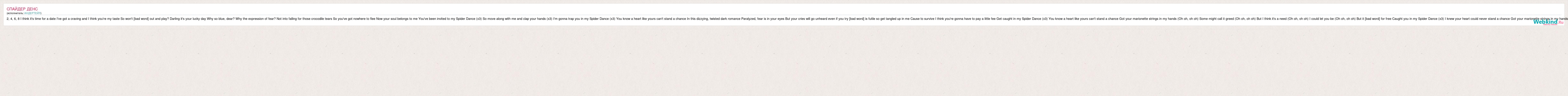 2, 4, 6, 8 I think it's time for a date I've got a craving and I think you're my taste So won't [bad word] out and play? Darling it's your lucky day Why so blue, dear? Why the expression of fear? Not into falling for those crocodile tears So you've got nowhere to flee Now your soul belongs to me You've been invited to my Spider Dance (x3) So move along with me and clap your hands (x3) I'm gonna trap you in my Spider Dance (x3) You know a heart like yours can't stand a chance In this dizzying, twisted dark romance Paralyzed, fear is in your eyes But your cries will go unheard even if you try [bad word] is futile so get tangled up in me Cause to survive I think you're gonna have to pay a little fee Get caught in my Spider Dance (x3) You know a heart like yours can't stand a chance Got your marionette strings in my hands (Oh oh, oh oh) Some might call it greed (Oh oh, oh oh) But I think it's a need (Oh oh, oh oh) I could let you be (Oh oh, oh oh) But it [bad word] for free Caught you in my Spider Dance (x3) I knew your heart could never stand a chance Got your marionette strings in my hands