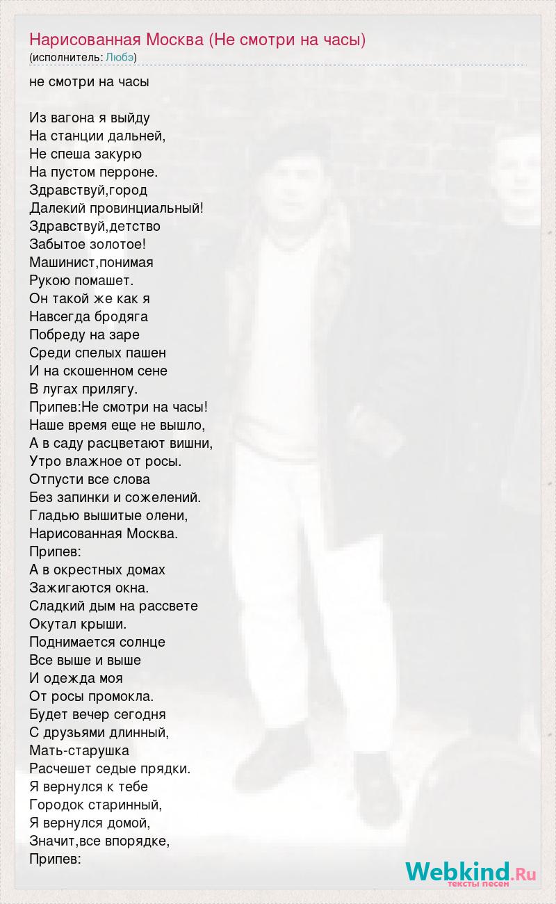 не смотри на часы Из вагона я выйду На станции дальней, Не спеша закурю На пустом перроне. Здравствуй,город Далекий провинциальный! Здравствуй,детство Забытое золотое! Машинист,понимая Рукою помашет. Он такой же как я Навсегда бродяга Побреду на заре Среди спелых пашен И на скошенном сене В лугах прилягу. Припев:Не смотри на часы! Наше время еще не вышло, А в саду расцветают вишни, Утро влажное от росы. Отпусти все слова Без запинки и сожелений. Гладью вышитые олени, Нарисованная Москва. Припев: А в окрестных домах Зажигаются окна. Сладкий дым на рассвете Окутал крыши. Поднимается солнце Все выше и выше И одежда моя От росы промокла. Будет вечер сегодня С друзьями длинный, Мать-старушка Расчешет седые прядки. Я вернулся к тебе Городок старинный, Я вернулся домой, Значит,все впорядке, Припев:
