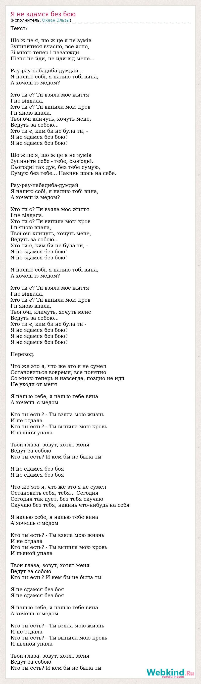 Текст: Шо ж це я, шо ж це я не зумів Зупинитися вчасно, все ясно, Зі мною тепер і назавжди Пізно не йди, не йди від мене... Рау-рау-пабадиба-думдай... Я налию собі, я налию тобі вина, А хочеш із медом? Хто ти є? Ти взяла моє життя І не віддала, Хто ти є? Ти випила мою кров І п'яною впала, Твої очі кличуть, хочуть мене, Ведуть за собою... Хто ти є, ким би не була ти, - Я не здамся без бою! Я не здамся без бою! Шо ж це я, шо ж це я не зумів Зупинити себе - тебе, сьогодні. Сьогодні так дує, без тебе сумую, Сумую без тебе... Накинь шось на себе. Рау-рау-пабадиба-думдай Я налию собі, я налию тобі вина, А хочеш із медом? Хто ти є? Ти взяла моє життя І не віддала. Хто ти є? Ти випила мою кров І п'яною впала, Твої очі кличуть, хочуть мене, Ведуть за собою... Хто ти є, ким би не була ти, - Я не здамся без бою! Я не здамся без бою! Я налию собі, я налию тобі вина, А хочеш із медом? Хто ти є? Ти взяла моє життя І не віддала, Хто ти є? Ти випила мою кров І п'яною впала, Твої очі, кличуть, хочуть мене Ведуть за собою... Хто ти є, ким би не була ти - Я не здамся без бою! Я не здамся без бою! Я не здамся без бою! Перевод: Что же это я, что же это я не сумел Остановиться вовремя, все понятно Со мною теперь и навсегда, поздно не иди Не уходи от меня Я налью себе, я налью тебе вина А хочешь с медом Кто ты есть? - Ты взяла мою жизнь И не отдала Кто ты есть? - Ты выпила мою кровь И пьяной упала Твои глаза, зовут, хотят меня Ведут за собою Кто ты есть? И кем бы не была ты Я не сдамся без боя Я не сдамся без боя Что же это я, что же это я не сумел Остановить себя, тебя... Сегодня Сегодня так дует, без тебя скучаю Скучаю без тебя, накинь что-нибудь на себя Я налью себе, я налью тебе вина А хочешь с медом Кто ты есть? - Ты взяла мою жизнь И не отдала Кто ты есть? - Ты выпила мою кровь И пьяной упала Твои глаза, зовут, хотят меня Ведут за собою Кто ты есть? И кем бы не была ты Я не сдамся без боя Я не сдамся без боя Я налью себе, я налью тебе вина А хочешь с медом Кто ты есть? - Ты взяла мою жизнь И не отдала Кто ты есть? - Ты выпила мою кровь И пьяной упала Твои глаза, зовут, хотят меня Ведут за собою Кто ты есть? И кем бы не была ты