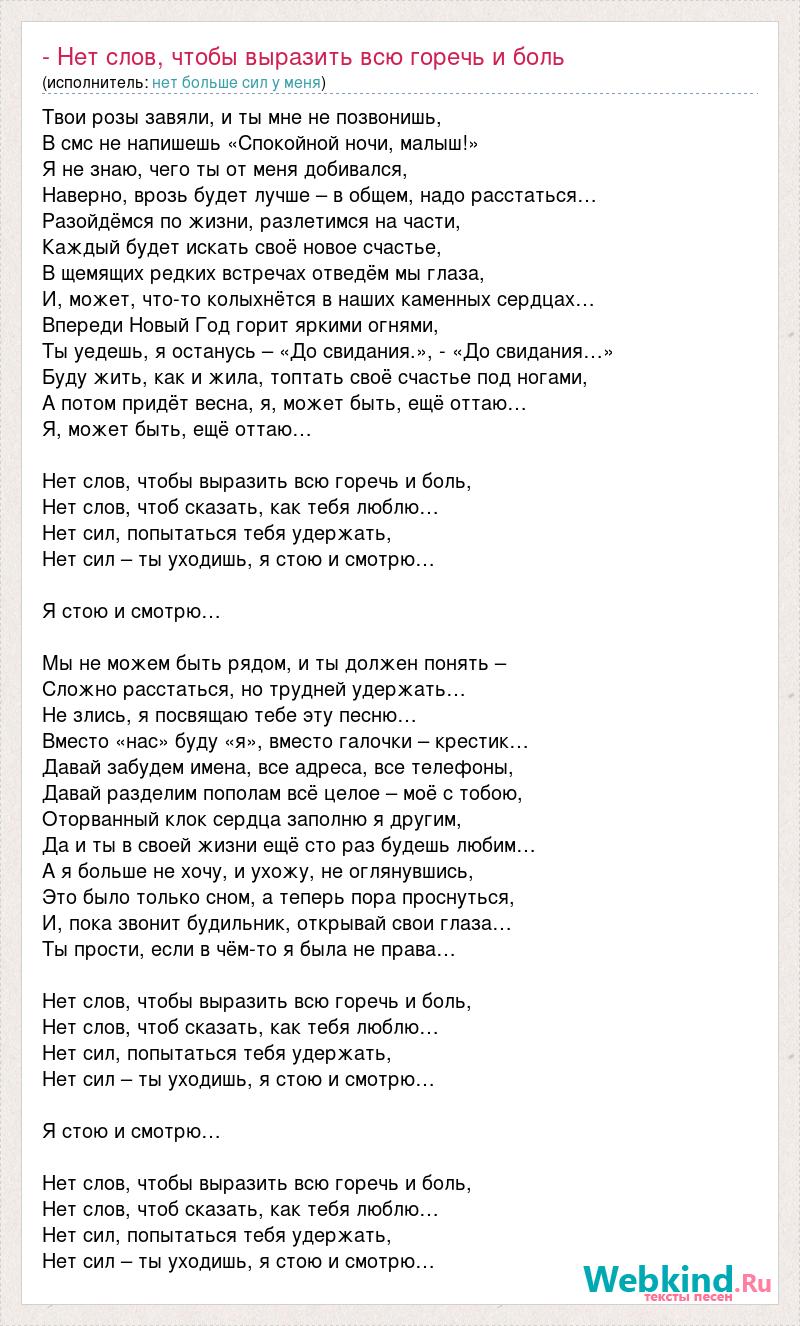 Твои розы завяли, и ты мне не позвонишь, В смс не напишешь «Спокойной ночи, малыш!» Я не знаю, чего ты от меня добивался, Наверно, врозь будет лучше – в общем, надо расстаться… Разойдёмся по жизни, разлетимся на части, Каждый будет искать своё новое счастье, В щемящих редких встречах отведём мы глаза, И, может, что-то колыхнётся в наших каменных сердцах… Впереди Новый Год горит яркими огнями, Ты уедешь, я останусь – «До свидания.», - «До свидания…» Буду жить, как и жила, топтать своё счастье под ногами, А потом придёт весна, я, может быть, ещё оттаю… Я, может быть, ещё оттаю… Нет слов, чтобы выразить всю горечь и боль, Нет слов, чтоб сказать, как тебя люблю… Нет сил, попытаться тебя удержать, Нет сил – ты уходишь, я стою и смотрю… Я стою и смотрю… Мы не можем быть рядом, и ты должен понять – Сложно расстаться, но трудней удержать… Не злись, я посвящаю тебе эту песню… Вместо «нас» буду «я», вместо галочки – крестик… Давай забудем имена, все адреса, все телефоны, Давай разделим пополам всё целое – моё с тобою, Оторванный клок сердца заполню я другим, Да и ты в своей жизни ещё сто раз будешь любим… А я больше не хочу, и ухожу, не оглянувшись, Это было только сном, а теперь пора проснуться, И, пока звонит будильник, открывай свои глаза… Ты прости, если в чём-то я была не права… Нет слов, чтобы выразить всю горечь и боль, Нет слов, чтоб сказать, как тебя люблю… Нет сил, попытаться тебя удержать, Нет сил – ты уходишь, я стою и смотрю… Я стою и смотрю… Нет слов, чтобы выразить всю горечь и боль, Нет слов, чтоб сказать, как тебя люблю… Нет сил, попытаться тебя удержать, Нет сил – ты уходишь, я стою и смотрю…
