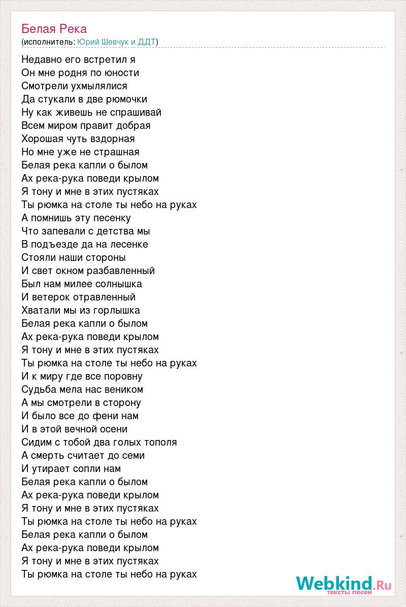 Недавно его встретил я Он мне родня по юности Смотрели ухмылялися Да стукали в две рюмочки Ну как живешь не спрашивай Всем миром правит добрая Хорошая чуть вздорная Но мне уже не страшная Белая река капли о былом Ах река-рука поведи крылом Я тону и мне в этих пустяках Ты рюмка на столе ты небо на руках А помнишь эту песенку Что запевали с детства мы В подъезде да на лесенке Стояли наши стороны И свет окном разбавленный Был нам милее солнышка И ветерок отравленный Хватали мы из горлышка Белая река капли о былом Ах река-рука поведи крылом Я тону и мне в этих пустяках Ты рюмка на столе ты небо на руках И к миру где все поровну Судьба мела нас веником А мы смотрели в сторону И было все до фени нам И в этой вечной осени Сидим с тобой два голых тополя А смерть считает до семи И утирает сопли нам Белая река капли о былом Ах река-рука поведи крылом Я тону и мне в этих пустяках Ты рюмка на столе ты небо на руках Белая река капли о былом Ах река-рука поведи крылом Я тону и мне в этих пустяках Ты рюмка на столе ты небо на руках
