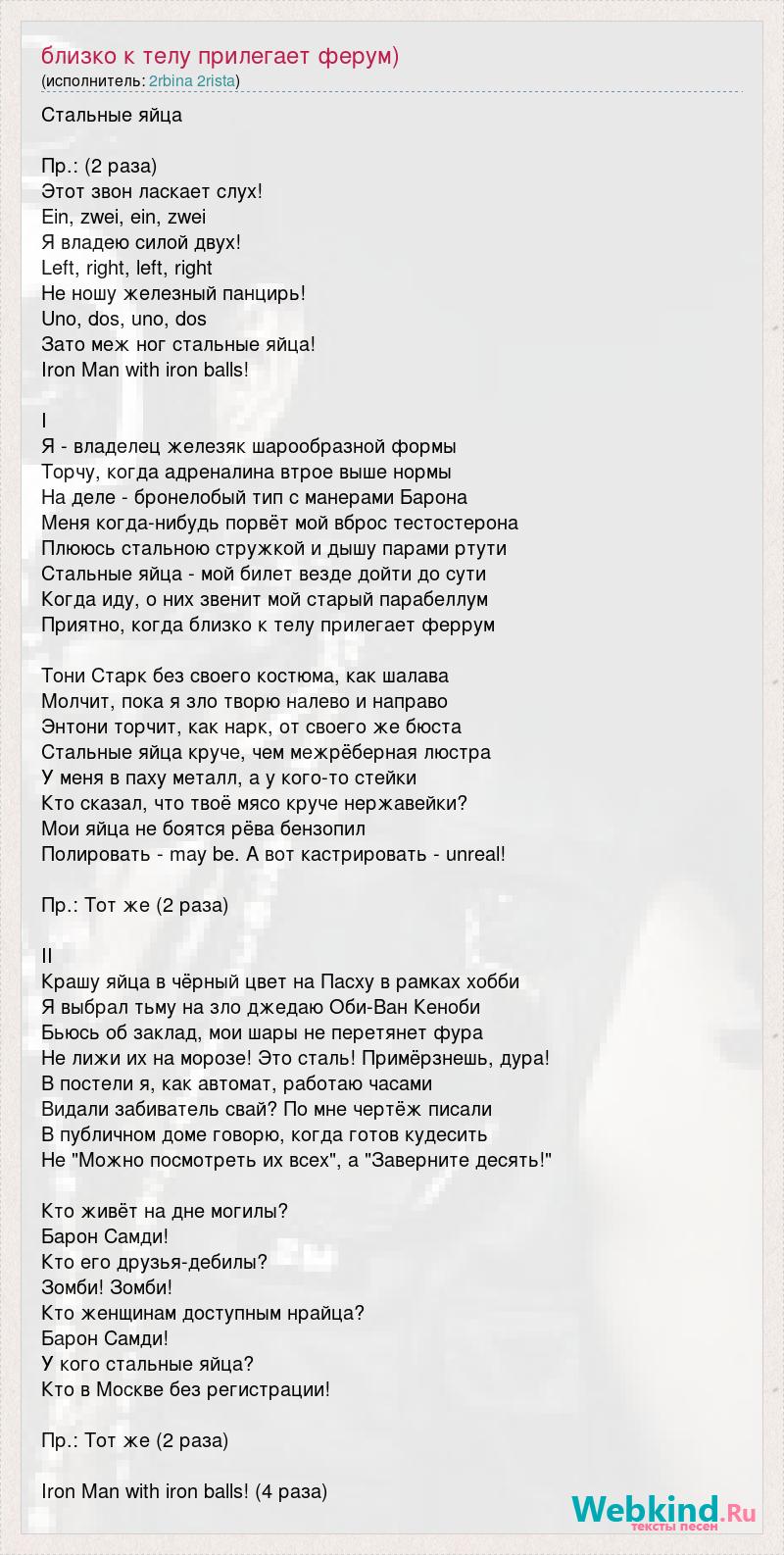 Стальные яйца Пр.: (2 раза) Этот звон ласкает слух! Ein, zwei, ein, zwei Я владею силой двух! Left, right, left, right Не ношу железный панцирь! Uno, dos, uno, dos Зато меж ног стальные яйца! Iron Man with iron balls! I Я - владелец железяк шарообразной формы Торчу, когда адреналина втрое выше нормы На деле - бронелобый тип с манерами Барона Меня когда-нибудь порвёт мой вброс тестостерона Плююсь стальною стружкой и дышу парами ртути Стальные яйца - мой билет везде дойти до сути Когда иду, о них звенит мой старый парабеллум Приятно, когда близко к телу прилегает феррум Тони Старк без своего костюма, как шалава Молчит, пока я зло творю налево и направо Энтони торчит, как нарк, от своего же бюста Стальные яйца круче, чем межрёберная люстра У меня в паху металл, а у кого-то стейки Кто сказал, что твоё мясо круче нержавейки? Мои яйца не боятся рёва бензопил Полировать - may be. А вот кастрировать - unreal! Пр.: Тот же (2 раза) II Крашу яйца в чёрный цвет на Пасху в рамках хобби Я выбрал тьму на зло джедаю Оби-Ван Кеноби Бьюсь об заклад, мои шары не перетянет фура Не лижи их на морозе! Это сталь! Примёрзнешь, дура! В постели я, как автомат, работаю часами Видали забиватель свай? По мне чертёж писали В публичном доме говорю, когда готов кудесить Не "Можно посмотреть их всех", а "Заверните десять!" Кто живёт на дне могилы? Барон Самди! Кто его друзья-дебилы? Зомби! Зомби! Кто женщинам доступным нрайца? Барон Самди! У кого стальные яйца? Кто в Москве без регистрации! Пр.: Тот же (2 раза) Iron Man with iron balls! (4 раза)