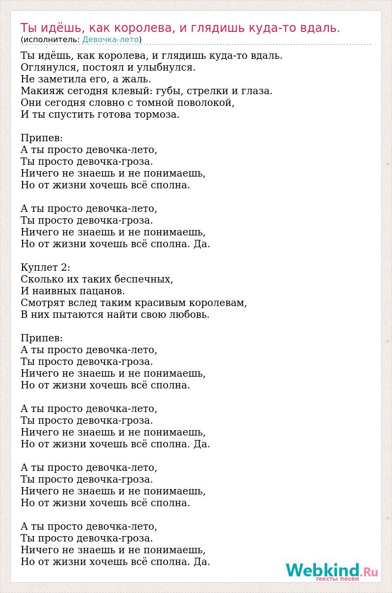 Ты идёшь, как королева, и глядишь куда-то вдаль. Оглянулся, постоял и улыбнулся. Не заметила его, а жаль. Макияж сегодня клевый: губы, стрелки и глаза. Они сегодня словно с томной поволокой, И ты спустить готова тормоза. Припев: А ты просто девочка-лето, Ты просто девочка-гроза. Ничего не знаешь и не понимаешь, Но от жизни хочешь всё сполна. А ты просто девочка-лето, Ты просто девочка-гроза. Ничего не знаешь и не понимаешь, Но от жизни хочешь всё сполна. Да. Куплет 2: Сколько их таких беспечных, И наивных пацанов. Смотрят вслед таким красивым королевам, В них пытаются найти свою любовь. Припев: А ты просто девочка-лето, Ты просто девочка-гроза. Ничего не знаешь и не понимаешь, Но от жизни хочешь всё сполна. А ты просто девочка-лето, Ты просто девочка-гроза. Ничего не знаешь и не понимаешь, Но от жизни хочешь всё сполна. Да. А ты просто девочка-лето, Ты просто девочка-гроза. Ничего не знаешь и не понимаешь, Но от жизни хочешь всё сполна. А ты просто девочка-лето, Ты просто девочка-гроза. Ничего не знаешь и не понимаешь, Но от жизни хочешь всё сполна. Да.
