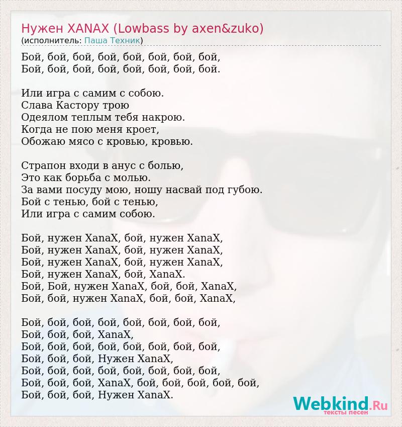 Бой, бой, бой, бой, бой, бой, бой, бой, Бой, бой, бой, бой, бой, бой, бой, бой. Или игра с самим с собою. Слава Кастору трою Одеялом теплым тебя накрою. Когда не пою меня кроет, Обожаю мясо с кровью, кровью. Страпон входи в анус с болью, Это как борьба с молью. За вами посуду мою, ношу насвай под губою. Бой с тенью, бой с тенью, Или игра с самим собою. Бой, нужен XanaX, бой, нужен XanaX, Бой, нужен XanaX, бой, нужен XanaX, Бой, нужен XanaX, бой, нужен XanaX, Бой, нужен XanaX, бой, XanaX. Бой, Бой, нужен XanaX, бой, бой, XanaX, Бой, бой, нужен XanaX, бой, бой, XanaX, Бой, бой, бой, бой, бой, бой, бой, бой, Бой, бой, бой, XanaX, Бой, бой, бой, бой, бой, бой, бой, бой, Бой, бой, бой, Нужен XanaX, Бой, бой, бой, бой, бой, бой, бой, бой, Бой, бой, бой, XanaX, бой, бой, бой, бой, бой, Бой, бой, бой, Нужен XanaX.
