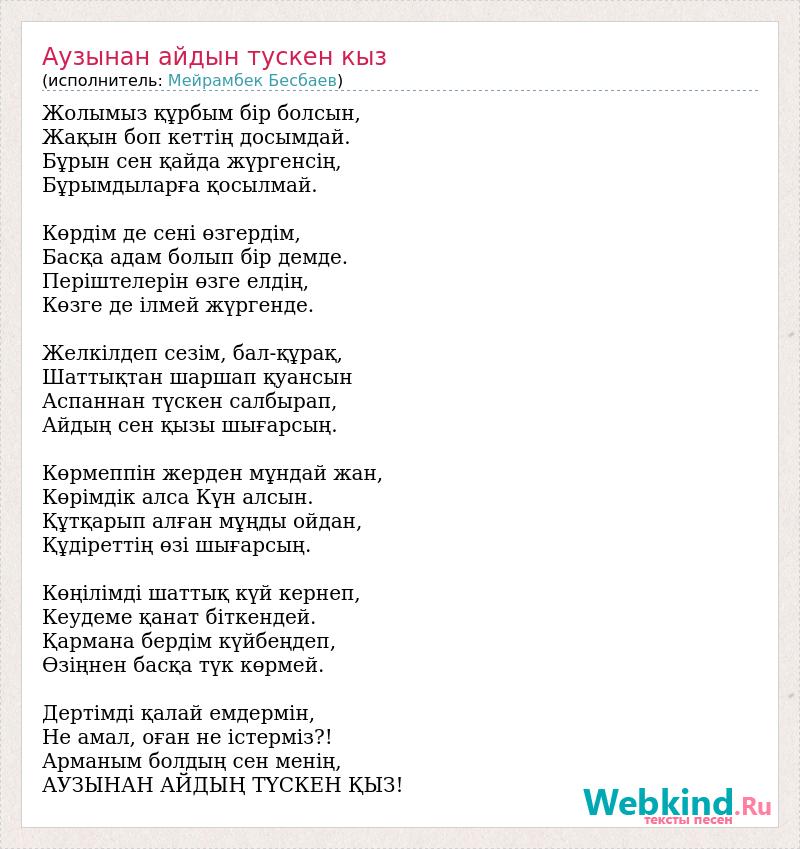 Жолымыз құрбым бір болсын, Жақын боп кеттің досымдай. Бұрын сен қайда жүргенсің, Бұрымдыларға қосылмай. Көрдім де сені өзгердім, Басқа адам болып бір демде. Періштелерін өзге елдің, Көзге де ілмей жүргенде. Желкілдеп сезім, бал-құрақ, Шаттықтан шаршап қуансын Аспаннан түскен салбырап, Айдың сен қызы шығарсың. Көрмеппін жерден мұндай жан, Көрімдік алса Күн алсын. Құтқарып алған мұңды ойдан, Құдіреттің өзі шығарсың. Көңілімді шаттық күй кернеп, Кеудеме қанат біткендей. Қармана бердім күйбеңдеп, Өзіңнен басқа түк көрмей. Дертімді қалай емдермін, Не амал, оған не істерміз?! Арманым болдың сен менің, АУЗЫНАН АЙДЫҢ ТҮСКЕН ҚЫЗ!