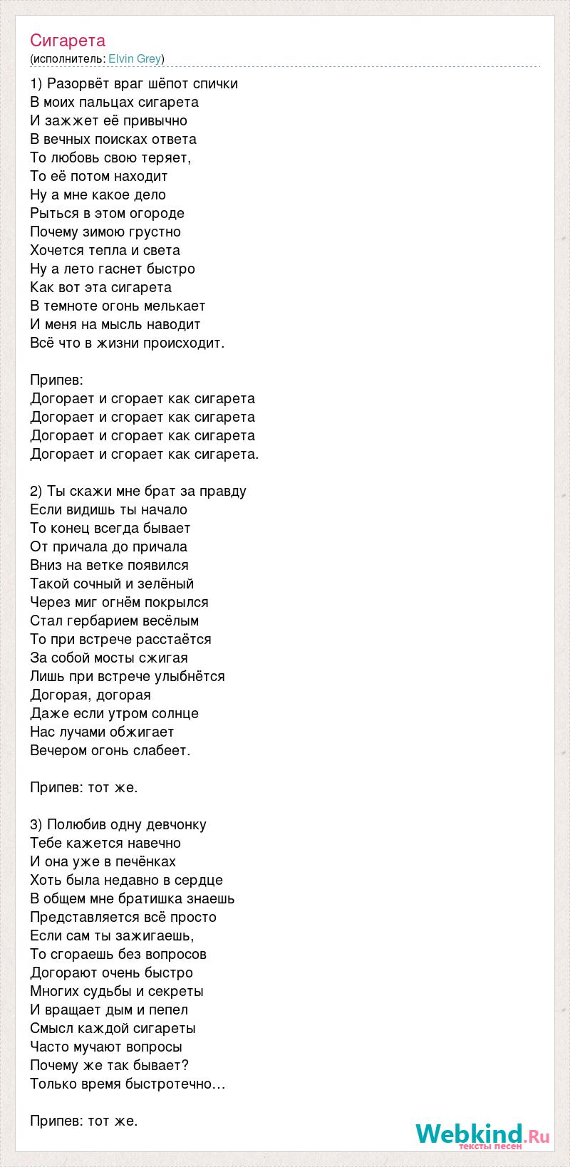 1) Разорвёт враг шёпот спички В моих пальцах сигарета И зажжет её привычно В вечных поисках ответа То любовь свою теряет, То её потом находит Ну а мне какое дело Рыться в этом огороде Почему зимою грустно Хочется тепла и света Ну а лето гаснет быстро Как вот эта сигарета В темноте огонь мелькает И меня на мысль наводит Всё что в жизни происходит. Припев: Догорает и сгорает как сигарета Догорает и сгорает как сигарета Догорает и сгорает как сигарета Догорает и сгорает как сигарета. 2) Ты скажи мне брат за правду Если видишь ты начало То конец всегда бывает От причала до причала Вниз на ветке появился Такой сочный и зелёный Через миг огнём покрылся Стал гербарием весёлым То при встрече расстаётся За собой мосты сжигая Лишь при встрече улыбнётся Догорая, догорая Даже если утром солнце Нас лучами обжигает Вечером огонь слабеет. Припев: тот же. 3) Полюбив одну девчонку Тебе кажется навечно И она уже в печёнках Хоть была недавно в сердце В общем мне братишка знаешь Представляется всё просто Если сам ты зажигаешь, То сгораешь без вопросов Догорают очень быстро Многих судьбы и секреты И вращает дым и пепел Смысл каждой сигареты Часто мучают вопросы Почему же так бывает? Только время быстротечно… Припев: тот же.