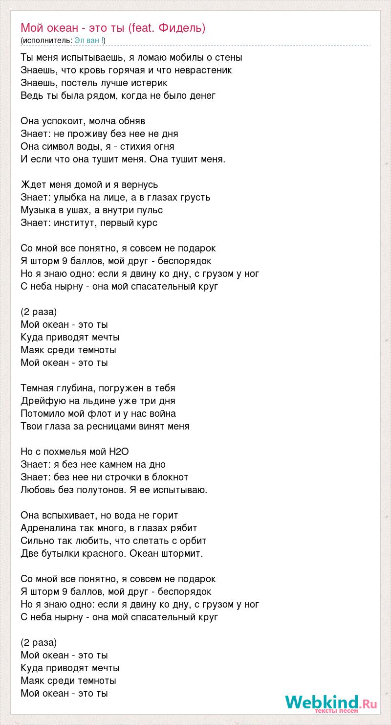 Ты меня испытываешь, я ломаю мобилы о стены Знаешь, что кровь горячая и что неврастеник Знаешь, постель лучше истерик Ведь ты была рядом, когда не было денег Она успокоит, молча обняв Знает: не проживу без нее не дня Она символ воды, я - стихия огня И если что она тушит меня. Она тушит меня. Ждет меня домой и я вернусь Знает: улыбка на лице, а в глазах грусть Музыка в ушах, а внутри пульс Знает: институт, первый курс Со мной все понятно, я совсем не подарок Я шторм 9 баллов, мой друг - беспорядок Но я знаю одно: если я двину ко дну, с грузом у ног С неба нырну - она мой спасательный круг (2 раза) Мой океан - это ты Куда приводят мечты Маяк среди темноты Мой океан - это ты Темная глубина, погружен в тебя Дрейфую на льдине уже три дня Потомило мой флот и у нас война Твои глаза за ресницами винят меня Но с похмелья мой H2O Знает: я без нее камнем на дно Знает: без нее ни строчки в блокнот Любовь без полутонов. Я ее испытываю. Она вспыхивает, но вода не горит Адреналина так много, в глазах рябит Сильно так любить, что слетать с орбит Две бутылки красного. Океан штормит. Со мной все понятно, я совсем не подарок Я шторм 9 баллов, мой друг - беспорядок Но я знаю одно: если я двину ко дну, с грузом у ног С неба нырну - она мой спасательный круг (2 раза) Мой океан - это ты Куда приводят мечты Маяк среди темноты Мой океан - это ты