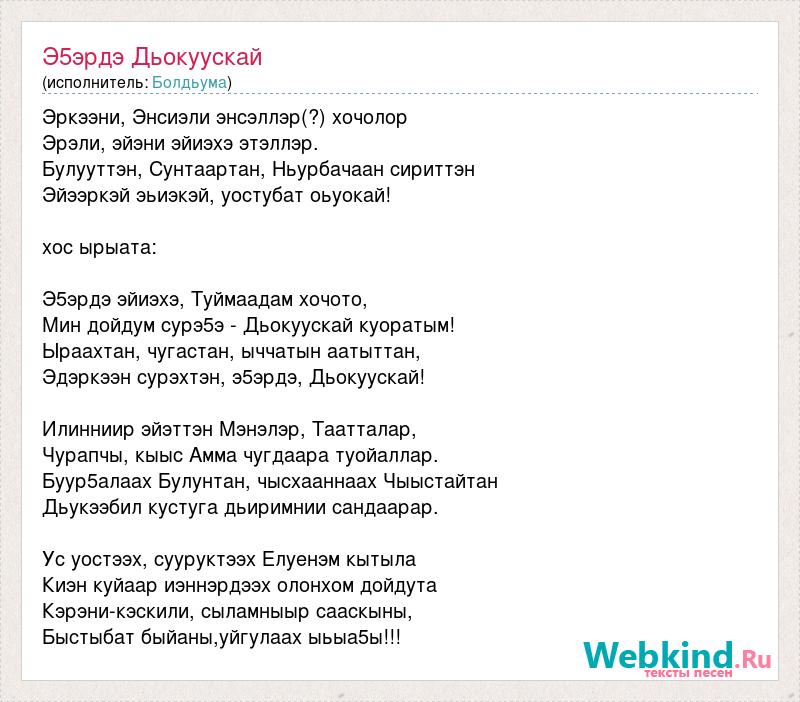 Эркээни, Энсиэли энсэллэр(?) хочолор Эрэли, эйэни эйиэхэ этэллэр. Булууттэн, Сунтаартан, Ньурбачаан сириттэн Эйээркэй эьиэкэй, уостубат оьуокай! хос ырыата: Э5эрдэ эйиэхэ, Туймаадам хочото, Мин дойдум сурэ5э - Дьокуускай куоратым! Ыраахтан, чугастан, ыччатын аатыттан, Эдэркээн сурэхтэн, э5эрдэ, Дьокуускай! Илинниир эйэттэн Мэнэлэр, Таатталар, Чурапчы, кыыс Амма чугдаара туойаллар. Буур5алаах Булунтан, чысхааннаах Чыыстайтан Дьукээбил кустуга дьиримнии сандаарар. Ус уостээх, сууруктээх Елуенэм кытыла Киэн куйаар иэннэрдээх олонхом дойдута Кэрэни-кэскили, сыламныыр сааскыны, Быстыбат быйаны,уйгулаах ыьыа5ы!!!