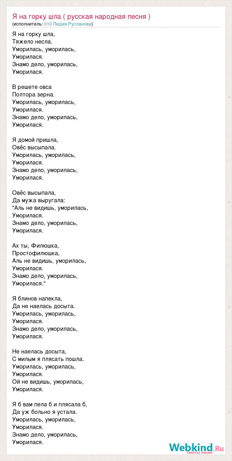 Я на горку шла, Тяжело несла. Уморилась, уморилась, Уморилася. Знамо дело, уморилась, Уморилася. В решете овса Полтора зерна. Уморилась, уморилась, Уморилася. Знамо дело, уморилась, Уморилася. Я домой пришла, Овёс высыпала. Уморилась, уморилась, Уморилася. Знамо дело, уморилась, Уморилася. Овёс высыпала, Да мужа выругала: "Аль не видишь, уморилась, Уморилася. Знамо дело, уморилась, Уморилася. Ах ты, Филюшка, Простофилюшка, Аль не видишь, уморилась, Уморилася. Знамо дело, уморилась, Уморилася." Я блинов напекла, Да не наелась досыта. Уморилась, уморилась, Уморилася. Знамо дело, уморилась, Уморилася. Не наелась досыта, С милым я плясать пошла. Уморилась, уморилась, Уморилася. Ой не видишь, уморилась, Уморилася. Я б вам пела б и плясала б, Да уж больно я устала. Уморилась, уморилась, Уморилася. Знамо дело, уморилась, Уморилася.