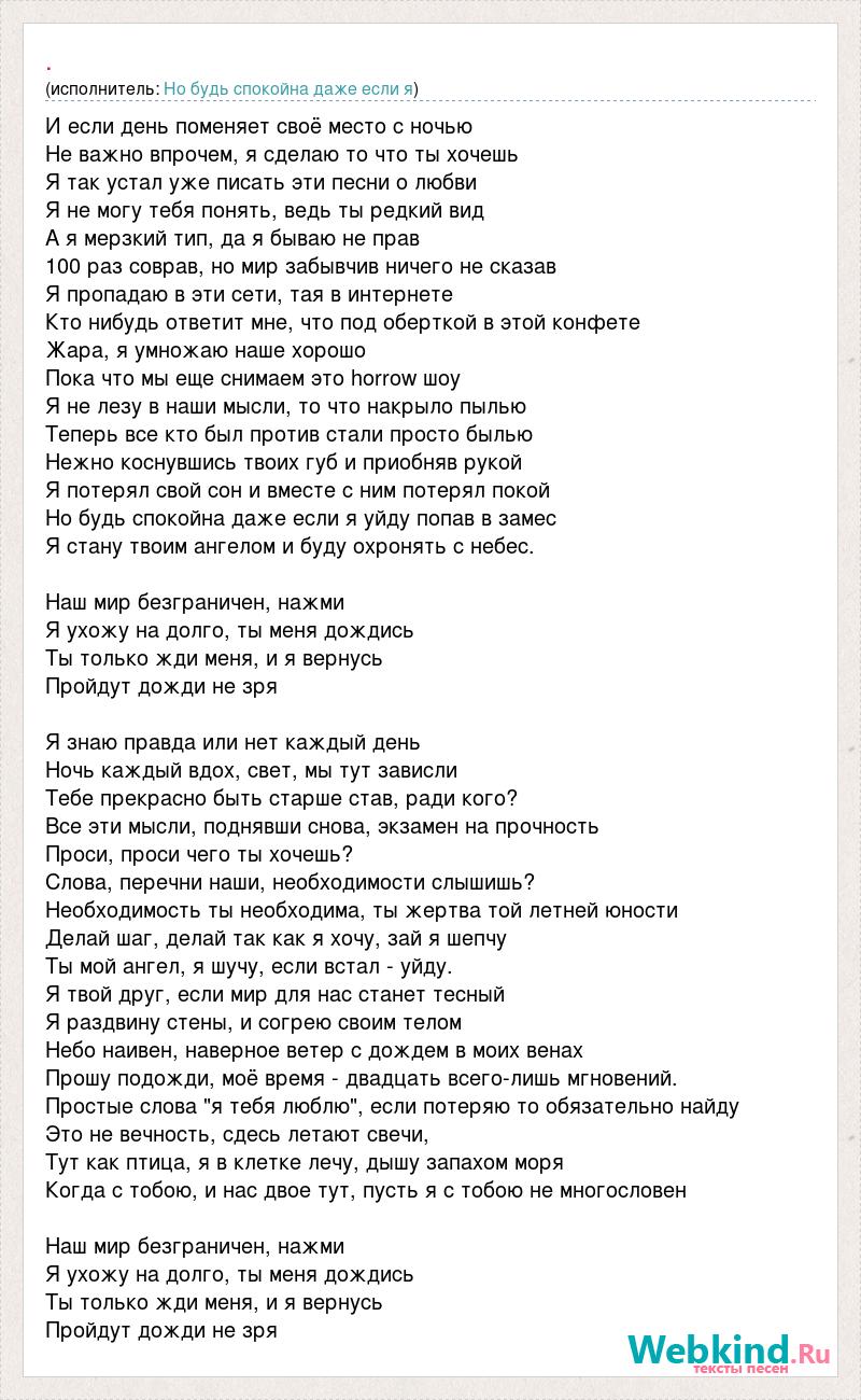 И если день поменяет своё место с ночью Не важно впрочем, я сделаю то что ты хочешь Я так устал уже писать эти песни о любви Я не могу тебя понять, ведь ты редкий вид А я мерзкий тип, да я бываю не прав 100 раз соврав, но мир забывчив ничего не сказав Я пропадаю в эти сети, тая в интернете Кто нибудь ответит мне, что под оберткой в этой конфете Жара, я умножаю наше хорошо Пока что мы еще снимаем это horrow шоу Я не лезу в наши мысли, то что накрыло пылью Теперь все кто был против стали просто былью Нежно коснувшись твоих губ и приобняв рукой Я потерял свой сон и вместе с ним потерял покой Но будь спокойна даже если я уйду попав в замес Я стану твоим ангелом и буду охронять с небес. Наш мир безграничен, нажми Я ухожу на долго, ты меня дождись Ты только жди меня, и я вернусь Пройдут дожди не зря Я знаю правда или нет каждый день Ночь каждый вдох, свет, мы тут зависли Тебе прекрасно быть старше став, ради кого? Все эти мысли, поднявши снова, экзамен на прочность Проси, проси чего ты хочешь? Слова, перечни наши, необходимости слышишь? Необходимость ты необходима, ты жертва той летней юности Делай шаг, делай так как я хочу, зай я шепчу Ты мой ангел, я шучу, если встал - уйду. Я твой друг, если мир для нас станет тесный Я раздвину стены, и согрею своим телом Небо наивен, наверное ветер с дождем в моих венах Прошу подожди, моё время - двадцать всего-лишь мгновений. Простые слова "я тебя люблю", если потеряю то обязательно найду Это не вечность, сдесь летают свечи, Тут как птица, я в клетке лечу, дышу запахом моря Когда с тобою, и нас двое тут, пусть я с тобою не многословен Наш мир безграничен, нажми Я ухожу на долго, ты меня дождись Ты только жди меня, и я вернусь Пройдут дожди не зря
