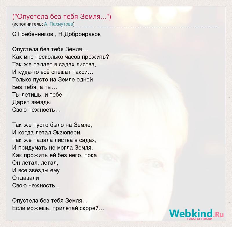 С.Гребенников , Н.Добронравов Опустела без тебя Земля… Как мне несколько часов прожить? Так же падает в садах листва, И куда-то всё спешат такси… Только пусто на Земле одной Без тебя, а ты… Ты летишь, и тебе Дарят звёзды Свою нежность… Так же пусто было на Земле, И когда летал Экзюпери, Так же падала листва в садах, И придумать не могла Земля. Как прожить ей без него, пока Он летал, летал, И все звёзды ему Отдавали Свою нежность… Опустела без тебя Земля… Если можешь, прилетай скорей…