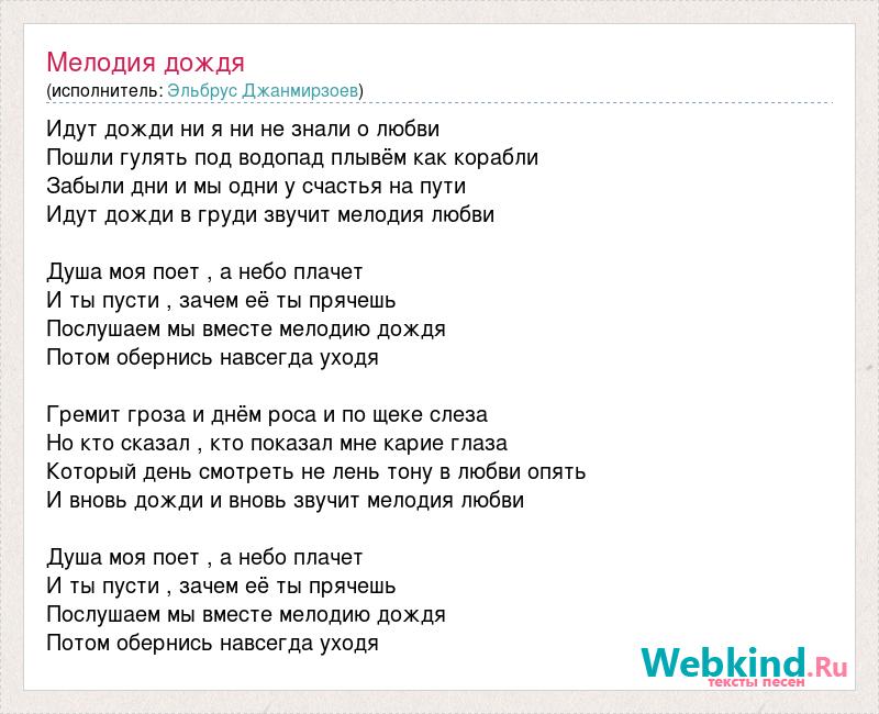Идут дожди ни я ни не знали о любви Пошли гулять под водопад плывём как корабли Забыли дни и мы одни у счастья на пути Идут дожди в груди звучит мелодия любви Душа моя поет , а небо плачет И ты пусти , зачем её ты прячешь Послушаем мы вместе мелодию дождя Потом обернись навсегда уходя Гремит гроза и днём роса и по щеке слеза Но кто сказал , кто показал мне карие глаза Который день смотреть не лень тону в любви опять И вновь дожди и вновь звучит мелодия любви Душа моя поет , а небо плачет И ты пусти , зачем её ты прячешь Послушаем мы вместе мелодию дождя Потом обернись навсегда уходя