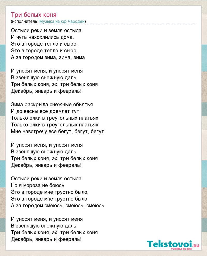 Остыли реки и земля остыла И чуть нахохлились дома. Это в городе тепло и сыро, Это в городе тепло и сыро, А за городом зима, зима, зима И уносят меня, и уносят меня В звенящую снежную даль Три белых коня, эх, три белых коня Декабрь, январь и февраль! Зима раскрыла снежные обьятья И до весны все дремлет тут Только елки в треугольных платьях Только елки в треугольных платьях Мне навстречу все бегут, бегут, бегут И уносят меня, и уносят меня В звенящую снежную даль Три белых коня, эх, три белых коня Декабрь, январь и февраль! Остыли реки и земля остыла Но я мороза не боюсь Это в городе мне грустно было, Это в городе мне грустно было А за городом смеюсь, смеюсь, смеюсь И уносят меня, и уносят меня В звенящую снежную даль Три белых коня, эх, три белых коня Декабрь, январь и февраль!