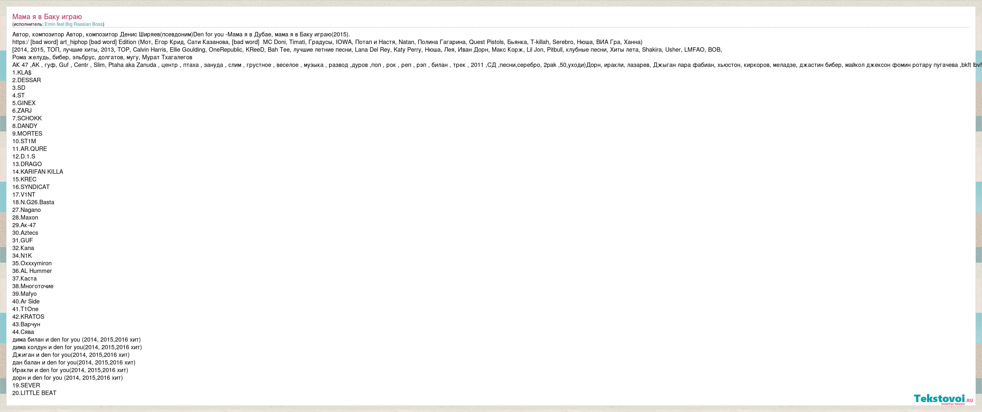 Автор, композитор Автор, композитор Денис Ширяев(псевдоним)Den for you -Мама я в Дубае, мама я в Баку играю(2015). https:/ [bad word] art_hiphop [bad word] Edition (Мот, Егор Крид, Сати Казанова, [bad word] MC Doni, Timati, Градусы, IOWA, Потап и Настя, Natan, Полина Гагарина, Quest Pistols, Бьянка, T-killah, Serebro, Нюша, ВИА Гра, Ханна) [2014, 2015, ТОП, лучшие хиты, 2013, TOP, Calvin Harris, Ellie Goulding, OneRepublic, KReeD, Bah Tee, лучшие летние песни, Lana Del Rey, Katy Perry, Нюша, Лея, Иван Дорн, Макс Корж, Lil Jon, Pitbull, клубные песни, Хиты лета, Shakira, Usher, LMFAO, BOB, Рома желудь, бибер, эльбрус, долгатов, мугу, Мурат Тхагалегов АК 47 ,AK , гуф, Guf , Centr , Slim, Ptaha aka Zanuda , центр , птаха , зануда , слим , грустное , веселое , музыка , развод ,дуров ,поп , рок , реп , рэп , билан , трек , 2011 ,СД ,песни,серебро, 2pak ,50,уходи)Дорн, иракли, лазарев, Джыган лара фабиан, хьюстон, киркоров, меладзе, джастин бибер, майкол джексон фомин ротару пугачева ,bkft lbvf 1.KLA$ 2.DESSAR 3.SD 4.ST 5.GINEX 6.ZARJ 7.SCHOKK 8.DANDY 9.MORTES 10.ST1M 11.AR.QURE 12.D.1.S 13.DRAGO 14.KARIFAN KILLA 15.KREC 16.SYNDICAT 17.V1NT 18.N.G26.Basta 27.Nagano 28.Maxon 29.Ак-47 30.Aztecs 31.GUF 32.Капа 34.N1K 35.Oxxxymiron 36.AL Hummer 37.Каста 38.Многоточие 39.Mafyo 40.Ar Side 41.T1One 42.KRATOS 43.Варчун 44.Сява дима билан и den for you (2014, 2015,2016 хит) дима колдун и den for you(2014, 2015,2016 хит) Джиган и den for you(2014, 2015,2016 хит) дан балан и den for you(2014, 2015,2016 хит) Иракли и den for you(2014, 2015,2016 хит) дорн и den for you (2014, 2015,2016 хит) 19.SEVER 20.LITTLE BEAT