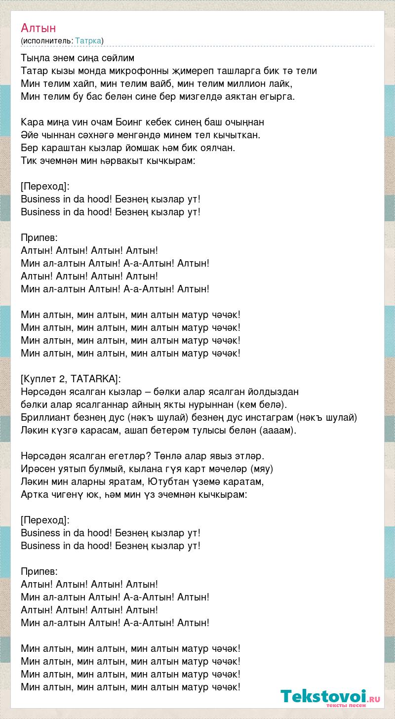 Тыңла энем cиңа сөйлим Татар кызы монда микрофонны җимереп ташларга бик тә тели Мин телим хайп, мин телим вайб, мин телим миллион лайк, Мин телим бу бас белән сине бер мизгелдә аяктан егырга. Кара миңа vин очам Боинг кебек синең баш очыңнан Әйе чыннан cәхнәгә менгәндә минем тел кычыткан. Бер караштан кызлар йомшак һәм бик оялчан. Тик эчемнән мин һәрвакыт кычкырам: [Переход]: Business in da hood! Безнең кызлар ут! Business in da hood! Безнең кызлар ут! Припев: Алтын! Алтын! Алтын! Алтын! Мин ал-алтын Алтын! А-а-Алтын! Алтын! Алтын! Алтын! Алтын! Алтын! Мин ал-алтын Алтын! А-а-Алтын! Алтын! Мин алтын, мин алтын, мин алтын матур чәчәк! Мин алтын, мин алтын, мин алтын матур чәчәк! Мин алтын, мин алтын, мин алтын матур чәчәк! Мин алтын, мин алтын, мин алтын матур чәчәк! [Куплет 2, TATARKA]: Нәрсәдән ясалган кызлар – бәлки алар ясалган йолдыздан бәлки алар ясалганнар айның якты нурыннан (кем белә). Бриллиант безнең дус (нәкъ шулай) безнең дус инстаграм (нәкъ шулай) Ләкин күзгә карасам, ашап бетерәм тулысы белән (аааам). Нәрсәдән ясалган егетләр? Төнлә алар явыз этләр. Ирәсен уятып булмый, кылана гүя карт мәчеләр (мяу) Ләкин мин аларны яратам, Ютубтан үземә каратам, Артка чигенү юк, һәм мин үз эчемнән кычкырам: [Переход]: Business in da hood! Безнең кызлар ут! Business in da hood! Безнең кызлар ут! Припев: Алтын! Алтын! Алтын! Алтын! Мин ал-алтын Алтын! А-а-Алтын! Алтын! Алтын! Алтын! Алтын! Алтын! Мин ал-алтын Алтын! А-а-Алтын! Алтын! Мин алтын, мин алтын, мин алтын матур чәчәк! Мин алтын, мин алтын, мин алтын матур чәчәк! Мин алтын, мин алтын, мин алтын матур чәчәк! Мин алтын, мин алтын, мин алтын матур чәчәк!
