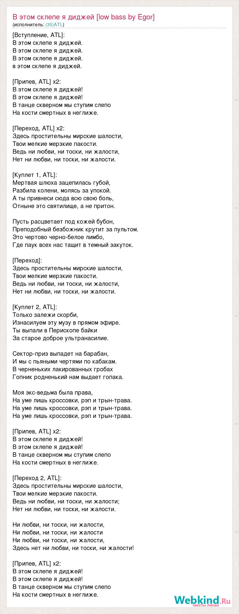[Вступление, ATL]: В этом склепе я диджей. В этом склепе я диджей. В этом склепе я диджей. в этом склепе я диджей. [Припев, ATL] х2: В этом склепе я диджей! В этом склепе я диджей! В танце скверном мы ступим слепо На кости смертных в неглиже. [Переход, ATL] x2: Здесь простительны мирские шалости, Твои мелкие мерзкие пакости. Ведь ни любви, ни тоски, ни жалости, Нет ни любви, ни тоски, ни жалости. [Куплет 1, ATL]: Мертвая шлюха зацепилась губой, Разбила колени, молясь за упокой. А ты привнеси сюда всю свою боль, Отныне это святилище, а не притон. Пусть расцветает под кожей бубон, Преподобный безбожник крутит за пультом. Это чертово черно-белое лимбо, Где паук всех нас тащит в темный закуток. [Переход]: Здесь простительны мирские шалости, Твои мелкие мерзкие пакости. Ведь ни любви, ни тоски, ни жалости, Нет ни любви, ни тоски, ни жалости. [Куплет 2, ATL]: Только залежи скорби, Изнасилуем эту музу в прямом эфире. Ты выпали в Перископе байки За старое доброе ультранасилие. Сектор-приз выпадет на барабан, И мы с пьяными чертями по кабакам. В черненьких лакированных гробах Гопник родненький нам выдает гопака. Моя экс-ведьма была права, На уме лишь кроссовки, рэп и трын-трава. На уме лишь кроссовки, рэп и трын-трава. На уме лишь кроссовки, рэп и трын-трава. [Припев, ATL] х2: В этом склепе я диджей! В этом склепе я диджей! В танце скверном мы ступим слепо На кости смертных в неглиже. [Переход 2, ATL]: Здесь простительны мирские шалости, Твои мелкие мерзкие пакости. Ведь ни любви, ни тоски, ни жалости; Нет ни любви, ни тоски, ни жалости. Ни любви, ни тоски, ни жалости, Ни любви, ни тоски, ни жалости Ни любви, ни тоски, ни жалости, Здесь нет ни любви, ни тоски, ни жалости! [Припев, ATL] х2: В этом склепе я диджей! В этом склепе я диджей! В танце скверном мы ступим слепо На кости смертных в неглиже.