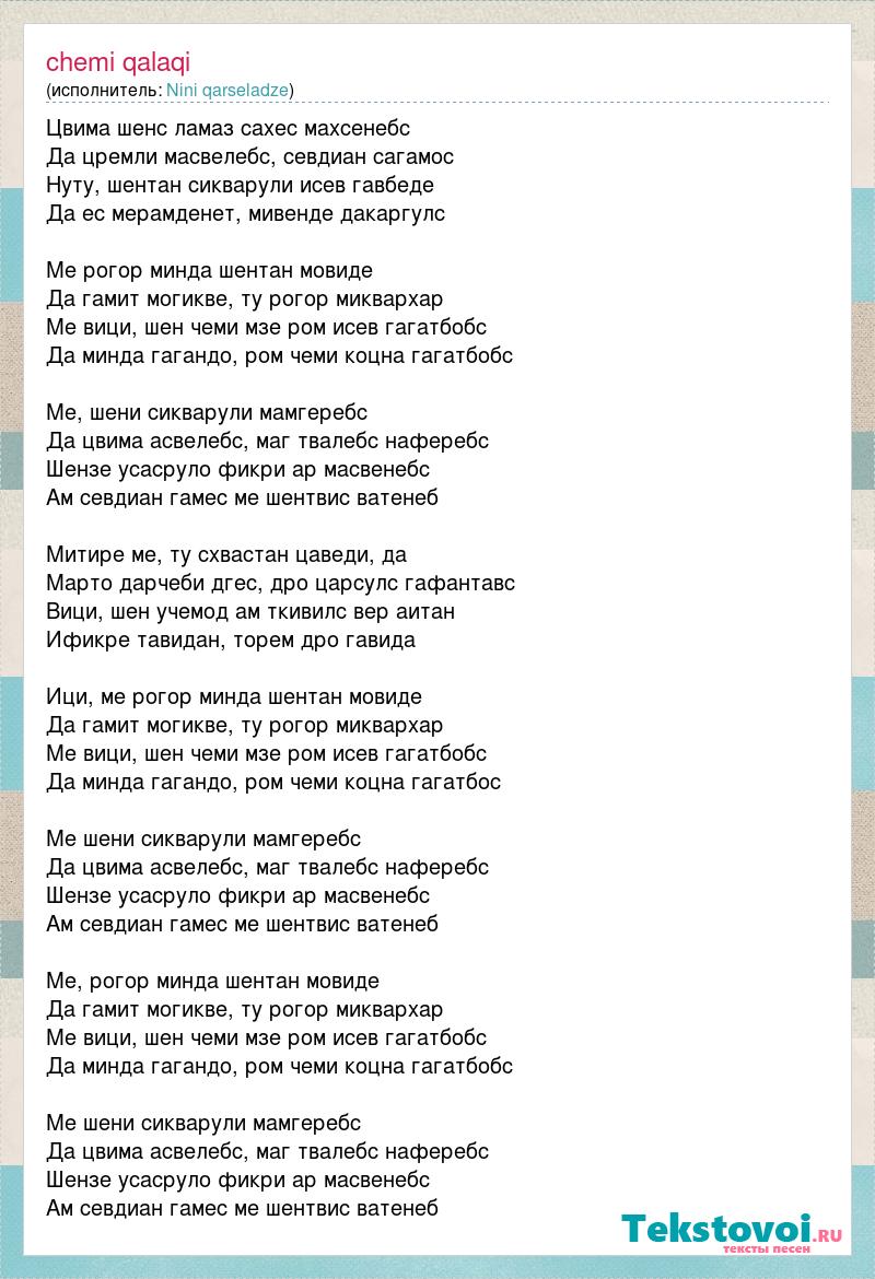 Цвима шенс ламаз сахес махсенебс Да цремли масвелебс, севдиан сагамос Нуту, шентан сикварули исев гавбеде Да ес мерамденет, мивенде дакаргулс Ме рогор минда шентан мовиде Да гамит могикве, ту рогор миквархар Ме вици, шен чеми мзе ром исев гагатбобс Да минда гагандо, ром чеми коцна гагатбобс Ме, шени сикварули мамгеребс Да цвима асвелебс, маг твалебс наферебс Шензе усасруло фикри ар масвенебс Ам севдиан гамес ме шентвис ватенеб Митире ме, ту схвастан цаведи, да Марто дарчеби дгес, дро царсулс гафантавс Вици, шен учемод ам ткивилс вер аитан Ификре тавидан, торем дро гавида Ици, ме рогор минда шентан мовиде Да гамит могикве, ту рогор миквархар Ме вици, шен чеми мзе ром исев гагатбобс Да минда гагандо, ром чеми коцна гагатбос Ме шени сикварули мамгеребс Да цвима асвелебс, маг твалебс наферебс Шензе усасруло фикри ар масвенебс Ам севдиан гамес ме шентвис ватенеб Ме, рогор минда шентан мовиде Да гамит могикве, ту рогор миквархар Ме вици, шен чеми мзе ром исев гагатбобс Да минда гагандо, ром чеми коцна гагатбобс Ме шени сикварули мамгеребс Да цвима асвелебс, маг твалебс наферебс Шензе усасруло фикри ар масвенебс Ам севдиан гамес ме шентвис ватенеб
