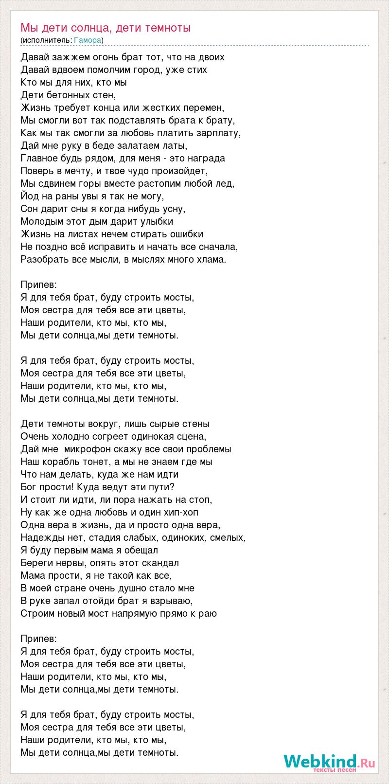 Давай зажжем огонь брат тот, что на двоих Давай вдвоем помолчим город, уже стих Кто мы для них, кто мы Дети бетонных стен, Жизнь требует конца или жестких перемен, Мы смогли вот так подставлять брата к брату, Как мы так смогли за любовь платить зарплату, Дай мне руку в беде залатаем латы, Главное будь рядом, для меня - это награда Поверь в мечту, и твое чудо произойдет, Мы сдвинем горы вместе растопим любой лед, Йод на раны увы я так не могу, Сон дарит сны я когда нибудь усну, Молодым этот дым дарит улыбки Жизнь на листах нечем стирать ошибки Не поздно всё исправить и начать все сначала, Разобрать все мысли, в мыслях много хлама. Припев: Я для тебя брат, буду строить мосты, Моя сестра для тебя все эти цветы, Наши родители, кто мы, кто мы, Мы дети солнца,мы дети темноты. Я для тебя брат, буду строить мосты, Моя сестра для тебя все эти цветы, Наши родители, кто мы, кто мы, Мы дети солнца,мы дети темноты. Дети темноты вокруг, лишь сырые стены Очень холодно согреет одинокая сцена, Дай мне микрофон скажу все свои проблемы Наш корабль тонет, а мы не знаем где мы Что нам делать, куда же нам идти Бог прости! Куда ведут эти пути? И стоит ли идти, ли пора нажать на стоп, Ну как же одна любовь и один хип-хоп Одна вера в жизнь, да и просто одна вера, Надежды нет, стадия слабых, одиноких, смелых, Я буду первым мама я обещал Береги нервы, опять этот скандал Мама прости, я не такой как все, В моей стране очень душно стало мне В руке запал отойди брат я взрываю, Строим новый мост напрямую прямо к раю Припев: Я для тебя брат, буду строить мосты, Моя сестра для тебя все эти цветы, Наши родители, кто мы, кто мы, Мы дети солнца,мы дети темноты. Я для тебя брат, буду строить мосты, Моя сестра для тебя все эти цветы, Наши родители, кто мы, кто мы, Мы дети солнца,мы дети темноты.