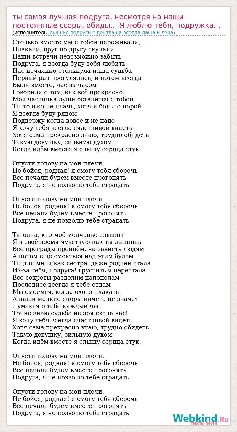 Столько вместе мы с тобой переживали, Плакали, друг по другу скучали Наши встречи невозможно забыть Подруга, я всегда буду тебя любить Нас нечаянно столкнула наша судьба Первый раз прогулялись, и потом всегда Были вместе, час за часом Говорили о том, как всё прекрасно. Моя частичка души останется с тобой Ты только не плачь, хотя и больно порой Я всегда буду рядом Поддержу когда вовсе и не надо Я хочу тебя всегда счастливой видеть Хотя сама прекрасно знаю, трудно обидеть Такую девушку, сильную духом Когда идём вместе я слышу сердца стук. Опусти голову на мои плечи, Не бойся, родная! я смогу тебя сберечь Все печали будем вместе прогонять Подруга, я не позволю тебе страдать Опусти голову на мои плечи, Не бойся, родная! я смогу тебя сберечь Все печали будем вместе прогонять Подруга, я не позволю тебе страдать Ты одна, кто моё молчанье слышит Я в своё время чувствую как ты дышишь Все преграды пройдём, на зависть людям А потом ещё смеяться над этим будем Ты для меня как сестра, даже родней стала Из-за тебя, подруга! грустить я перестала Все секреты разделим напополам Последнее всегда я тебе отдам Мы смеемся, когда охото плакать А наши мелкие споры ничего не значат Думаю я о тебе каждый час Точно знаю судьба не зря свела нас! Я хочу тебя всегда счастливой видеть Хотя сама прекрасно знаю, трудно обидеть Такую девушку, сильную духом Когда идём вместе я слышу сердца стук. Опусти голову на мои плечи, Не бойся, родная! я смогу тебя сберечь Все печали будем вместе прогонять Подруга, я не позволю тебе страдать Опусти голову на мои плечи, Не бойся, родная! я смогу тебя сберечь Все печали будем вместе прогонять Подруга, я не позволю тебе страдать