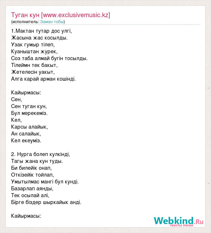 1.Мактан тутар дос улгi, Жасына жас косылды. Узак гумыр тiлеп, Куаныштан журек, Соз таба алмай бугiн тосылды. Тiлеймн тек бакыт, Жетелесiн уакыт, Алга карай арман кошiндi. Кайырмасы: Сен, Сен туган кун, Бул мерекемiз. Кел, Карсы алайык, Ан салайык, Кел екеумiз. 2. Нурга болеп кулкiндi, Тагы жана кун туды. Би билейiк онап, Откiзейiк тойлап, Умытылмас мангi бул кундi. Базарлап аянды, Тек осылай алi, Бiрге бiздер шыркайык андi. Кайырмасы: