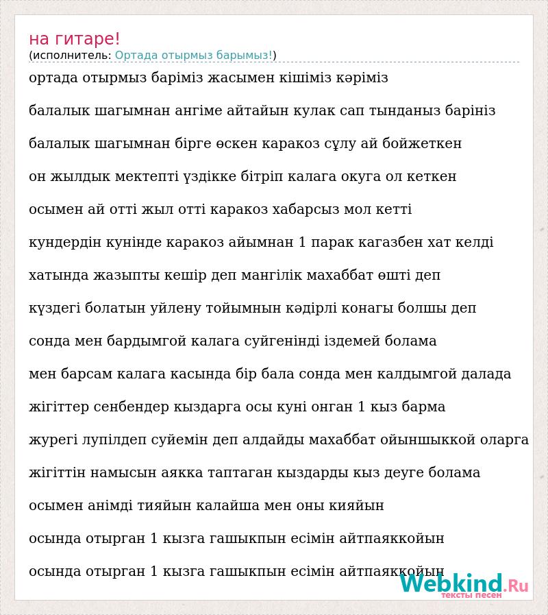 ортада отырмыз баріміз жасымен кішіміз кәріміз балалык шагымнан ангіме айтайын кулак сап тынданыз барініз балалык шагымнан бірге өскен каракоз сұлу ай бойжеткен он жылдык мектепті үздікке бітріп калага окуга ол кеткен осымен ай отті жыл отті каракоз хабарсыз мол кетті кундердін кунінде каракоз айымнан 1 парак кагазбен хат келді хатында жазыпты кешір деп мангілік махаббат өшті деп күздегі болатын уйлену тойымнын кәдірлі конагы болшы деп сонда мен бардымгой калага суйгенінді іздемей болама мен барсам калага касында бір бала сонда мен калдымгой далада жігіттер сенбендер кыздарга осы куні онган 1 кыз барма журегі лупілдеп суйемін деп алдайды махаббат ойыншыккой оларга жігіттін намысын аякка таптаган кыздарды кыз деуге болама осымен анімді тияйын калайша мен оны кияйын осында отырган 1 кызга гашыкпын есімін айтпаяккойын осында отырган 1 кызга гашыкпын есімін айтпаяккойын
