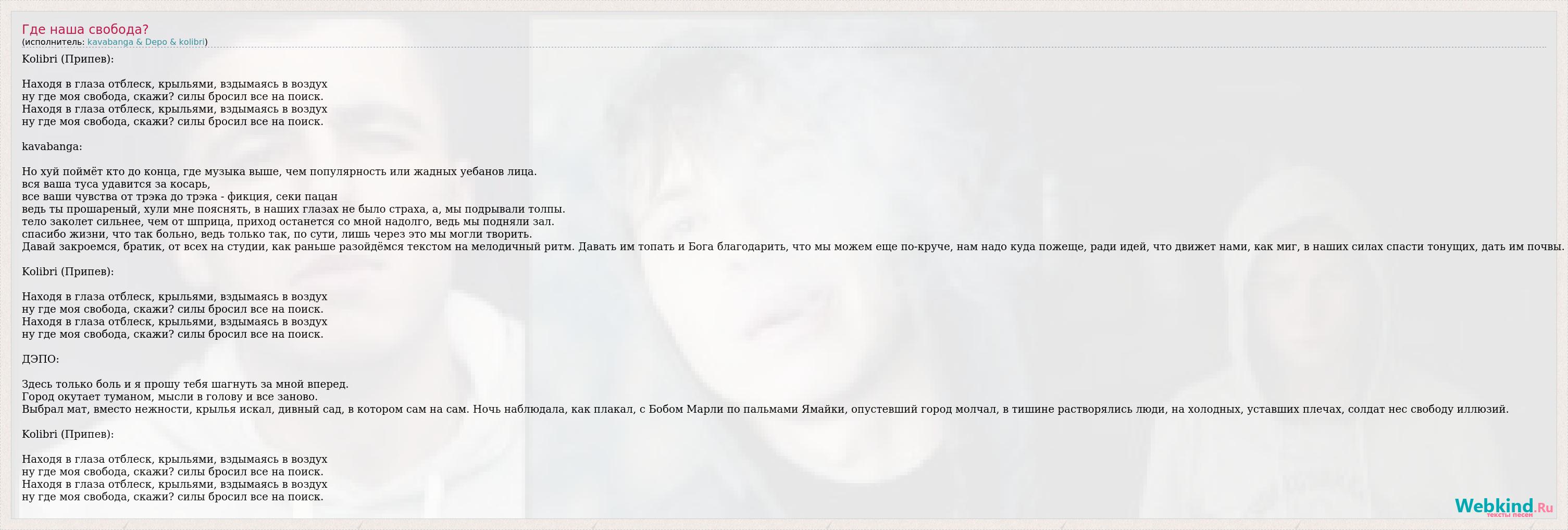 Kolibri (Припев): Находя в глаза отблеск, крыльями, вздымаясь в воздух ну где моя свобода, скажи? силы бросил все на поиск. Находя в глаза отблеск, крыльями, вздымаясь в воздух ну где моя свобода, скажи? силы бросил все на поиск. kavabanga: Но хуй поймёт кто до конца, где музыка выше, чем популярность или жадных уебанов лица. вся ваша туса удавится за косарь, все ваши чувства от трэка до трэка - фикция, секи пацан ведь ты прошареный, хули мне пояснять, в наших глазах не было страха, а, мы подрывали толпы. тело заколет сильнее, чем от шприца, приход останется со мной надолго, ведь мы подняли зал. спасибо жизни, что так больно, ведь только так, по сути, лишь через это мы могли творить. Давай закроемся, братик, от всех на студии, как раньше разойдёмся текстом на мелодичный ритм. Давать им топать и Бога благодарить, что мы можем еще по-круче, нам надо куда пожеще, ради идей, что движет нами, как миг, в наших силах спасти тонущих, дать им почвы. Kolibri (Припев): Находя в глаза отблеск, крыльями, вздымаясь в воздух ну где моя свобода, скажи? силы бросил все на поиск. Находя в глаза отблеск, крыльями, вздымаясь в воздух ну где моя свобода, скажи? силы бросил все на поиск. ДЭПО: Здесь только боль и я прошу тебя шагнуть за мной вперед. Город окутает туманом, мысли в голову и все заново. Выбрал мат, вместо нежности, крылья искал, дивный сад, в котором сам на сам. Ночь наблюдала, как плакал, с Бобом Марли по пальмами Ямайки, опустевший город молчал, в тишине растворялись люди, на холодных, уставших плечах, солдат нес свободу иллюзий. Kolibri (Припев): Находя в глаза отблеск, крыльями, вздымаясь в воздух ну где моя свобода, скажи? силы бросил все на поиск. Находя в глаза отблеск, крыльями, вздымаясь в воздух ну где моя свобода, скажи? силы бросил все на поиск.