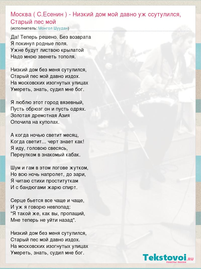 Главная→Исполнители→Монгол Шуудан→Москва ( С.Есенин ) - Низкий дом мой давно уж ссутулился, Старый пес мой