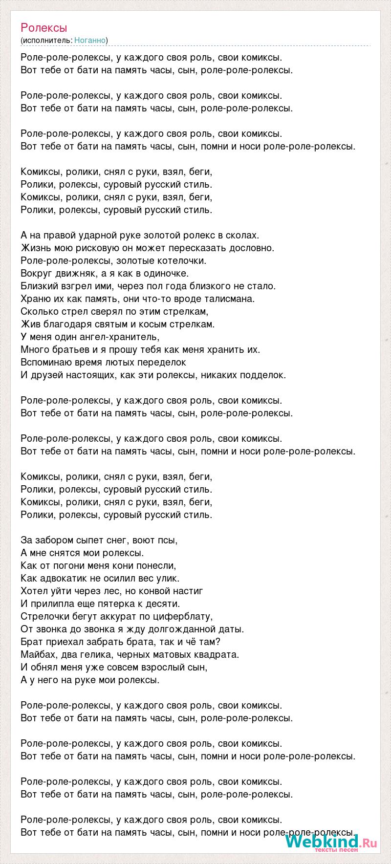 Роле-роле-ролексы, у каждого своя роль, свои комиксы. Вот тебе от бати на память часы, сын, роле-роле-ролексы. Роле-роле-ролексы, у каждого своя роль, свои комиксы. Вот тебе от бати на память часы, сын, роле-роле-ролексы. Роле-роле-ролексы, у каждого своя роль, свои комиксы. Вот тебе от бати на память часы, сын, помни и носи роле-роле-ролексы. Комиксы, ролики, снял с руки, взял, беги, Ролики, ролексы, суровый русский стиль. Комиксы, ролики, снял с руки, взял, беги, Ролики, ролексы, суровый русский стиль. А на правой ударной руке золотой ролекс в сколах. Жизнь мою рисковую он может пересказать дословно. Роле-роле-ролексы, золотые котелочки. Вокруг движняк, а я как в одиночке. Близкий взгрел ими, через пол года близкого не стало. Храню их как память, они что-то вроде талисмана. Сколько стрел сверял по этим стрелкам, Жив благодаря святым и косым стрелкам. У меня один ангел-хранитель, Много братьев и я прошу тебя как меня хранить их. Вспоминаю время лютых переделок И друзей настоящих, как эти ролексы, никаких подделок. Роле-роле-ролексы, у каждого своя роль, свои комиксы. Вот тебе от бати на память часы, сын, роле-роле-ролексы. Роле-роле-ролексы, у каждого своя роль, свои комиксы. Вот тебе от бати на память часы, сын, помни и носи роле-роле-ролексы. Комиксы, ролики, снял с руки, взял, беги, Ролики, ролексы, суровый русский стиль. Комиксы, ролики, снял с руки, взял, беги, Ролики, ролексы, суровый русский стиль. За забором сыпет снег, воют псы, А мне снятся мои ролексы. Как от погони меня кони понесли, Как адвокатик не осилил вес улик. Хотел уйти через лес, но конвой настиг И прилипла еще пятерка к десяти. Стрелочки бегут аккурат по циферблату, От звонка до звонка я жду долгожданной даты. Брат приехал забрать брата, так и чё там? Майбах, два гелика, черных матовых квадрата. И обнял меня уже совсем взрослый сын, А у него на руке мои ролексы. Роле-роле-ролексы, у каждого своя роль, свои комиксы. Вот тебе от бати на память часы, сын, роле-роле-ролексы. Роле-роле-ролексы, у каждого своя роль, свои комиксы. Вот тебе от бати на память часы, сын, помни и носи роле-роле-ролексы. Роле-роле-ролексы, у каждого своя роль, свои комиксы. Вот тебе от бати на память часы, сын, роле-роле-ролексы. Роле-роле-ролексы, у каждого своя роль, свои комиксы. Вот тебе от бати на память часы, сын, помни и носи роле-роле-ролексы.