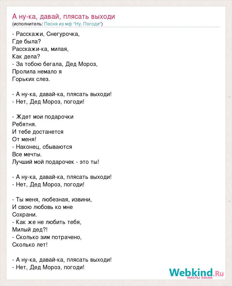 - Расскажи, Снегурочка, Где была? Расскажи-ка, милая, Как дела? - За тобою бегала, Дед Мороз, Пролила немало я Горьких слез. - А ну-ка, давай-ка, плясать выходи! - Нет, Дед Мороз, погоди! - Ждет мои подарочки Ребятня. И тебе достанется От меня! - Наконец, сбываются Все мечты. Лучший мой подарочек - это ты! - А ну-ка, давай-ка, плясать выходи! - Нет, Дед Мороз, погоди! - Ты меня, любезная, извини, И свою любовь ко мне Сохрани. - Как же не любить тебя, Милый дед?! - Сколько зим потрачено, Сколько лет! - А ну-ка, давай-ка, плясать выходи! - Нет, Дед Мороз, погоди!