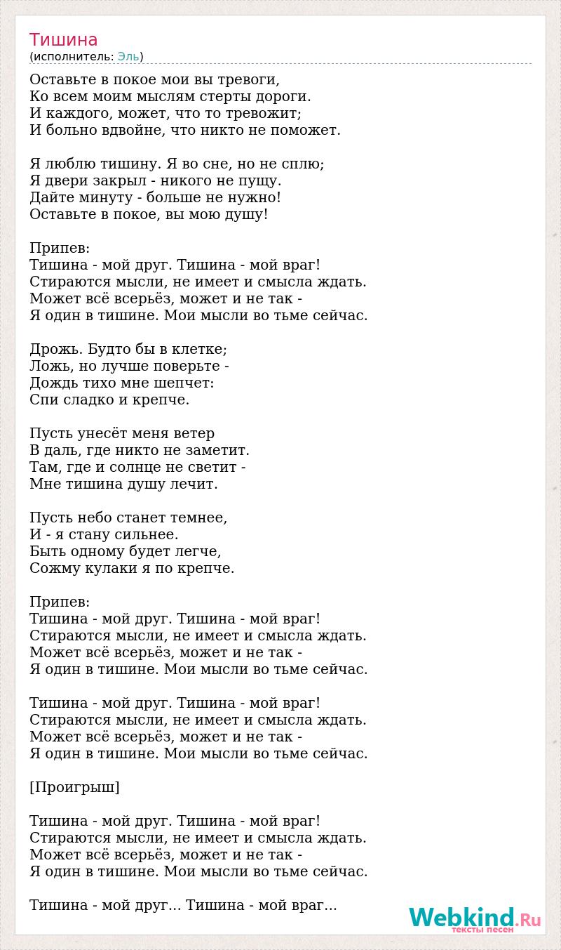 Оставьте в покое мои вы тревоги, Ко всем моим мыслям стерты дороги. И каждого, может, что то тревожит; И больно вдвойне, что никто не поможет. Я люблю тишину. Я во сне, но не сплю; Я двери закрыл - никого не пущу. Дайте минуту - больше не нужно! Оставьте в покое, вы мою душу! Припев: Тишина - мой друг. Тишина - мой враг! Стираются мысли, не имеет и смысла ждать. Может всё всерьёз, может и не так - Я один в тишине. Мои мысли во тьме сейчас. Дрожь. Будто бы в клетке; Ложь, но лучше поверьте - Дождь тихо мне шепчет: Спи сладко и крепче. Пусть унесёт меня ветер В даль, где никто не заметит. Там, где и солнце не светит - Мне тишина душу лечит. Пусть небо станет темнее, И - я стану сильнее. Быть одному будет легче, Сожму кулаки я по крепче. Припев: Тишина - мой друг. Тишина - мой враг! Стираются мысли, не имеет и смысла ждать. Может всё всерьёз, может и не так - Я один в тишине. Мои мысли во тьме сейчас. Тишина - мой друг. Тишина - мой враг! Стираются мысли, не имеет и смысла ждать. Может всё всерьёз, может и не так - Я один в тишине. Мои мысли во тьме сейчас. [Проигрыш] Тишина - мой друг. Тишина - мой враг! Стираются мысли, не имеет и смысла ждать. Может всё всерьёз, может и не так - Я один в тишине. Мои мысли во тьме сейчас. Тишина - мой друг... Тишина - мой враг...