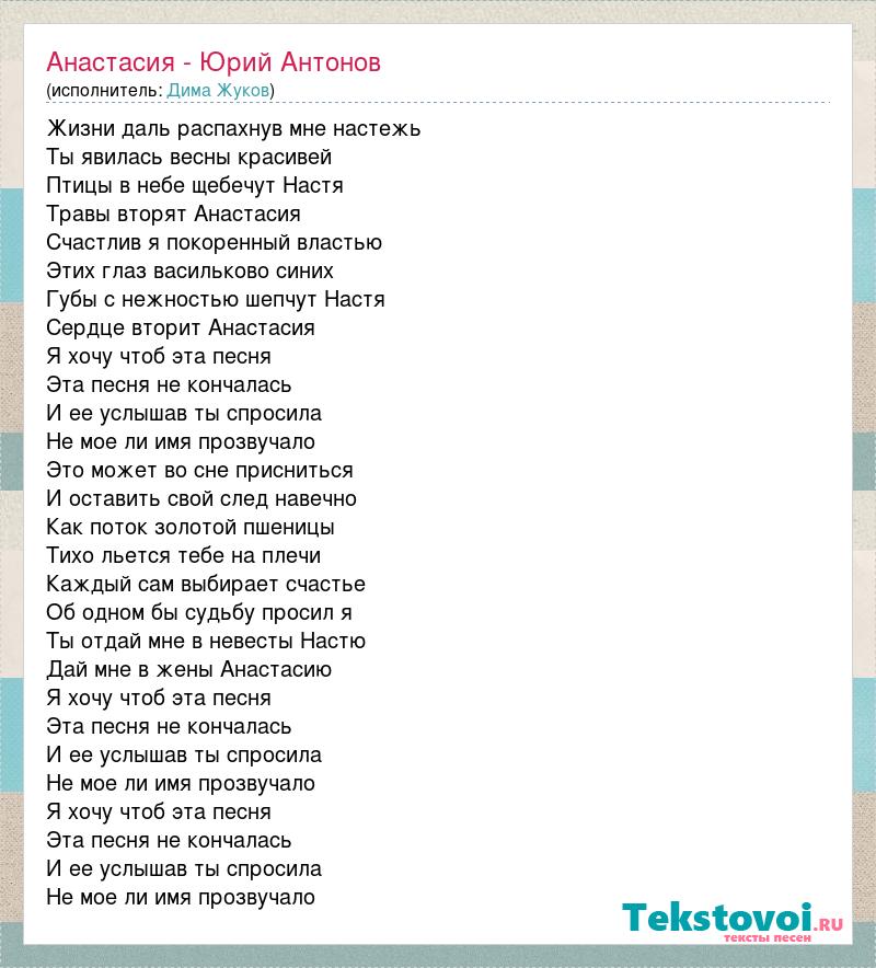 Жизни даль распахнув мне настежь Ты явилась весны красивей Птицы в небе щебечут Настя Травы вторят Анастасия Счастлив я покоренный властью Этих глаз васильково синих Губы с нежностью шепчут Настя Сердце вторит Анастасия Я хочу чтоб эта песня Эта песня не кончалась И ее услышав ты спросила Не мое ли имя прозвучало Это может во сне присниться И оставить свой след навечно Как поток золотой пшеницы Тихо льется тебе на плечи Каждый сам выбирает счастье Об одном бы судьбу просил я Ты отдай мне в невесты Настю Дай мне в жены Анастасию Я хочу чтоб эта песня Эта песня не кончалась И ее услышав ты спросила Не мое ли имя прозвучало Я хочу чтоб эта песня Эта песня не кончалась И ее услышав ты спросила Не мое ли имя прозвучало