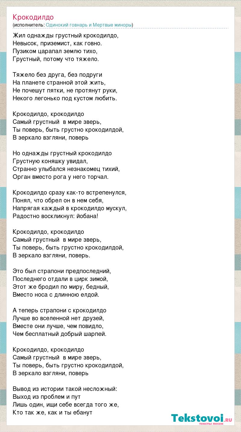 Жил однажды грустный крокодилдо, Невысок, приземист, как говно. Пузиком царапал землю тихо, Грустный, потому что тяжело. Тяжело без друга, без подруги На планете странной этой жить, Не почешут пятки, не протянут руки, Некого легонько под кустом любить. Крокодилдо, крокодилдо Самый грустный в мире зверь, Ты поверь, быть грустно крокодилдой, В зеркало взгляни, поверь Но однажды грустный крокодилдо Грустную коняшку увидал, Странно улыбался незнакомец тихий, Орган вместо рога у него торчал. Крокодилдо сразу как-то встрепенулся, Понял, что обрел он в нем себя, Напрягая каждый в крокодилдо мускул, Радостно воскликнул: йобана! Крокодилдо, крокодилдо Самый грустный в мире зверь, Ты поверь, быть грустно крокодилдой, В зеркало взгляни, поверь. Это был страпони предпоследний, Последнего отдали в цирк зимой, Этот же бродил по миру, бедный, Вместо носа с длинною елдой. А теперь страпони с крокодилдо Лучше во вселенной нет друзей, Вместе они лучше, чем повидло, Чем бесплатный добрый шарпей. Крокодилдо, крокодилдо Самый грустный в мире зверь, Ты поверь, быть грустно крокодилдой, В зеркало взгляни, поверь Вывод из истории такой несложный: Выход из проблем и пут Лишь один, ищи себе всегда того же, Кто так же, как и ты ебанут