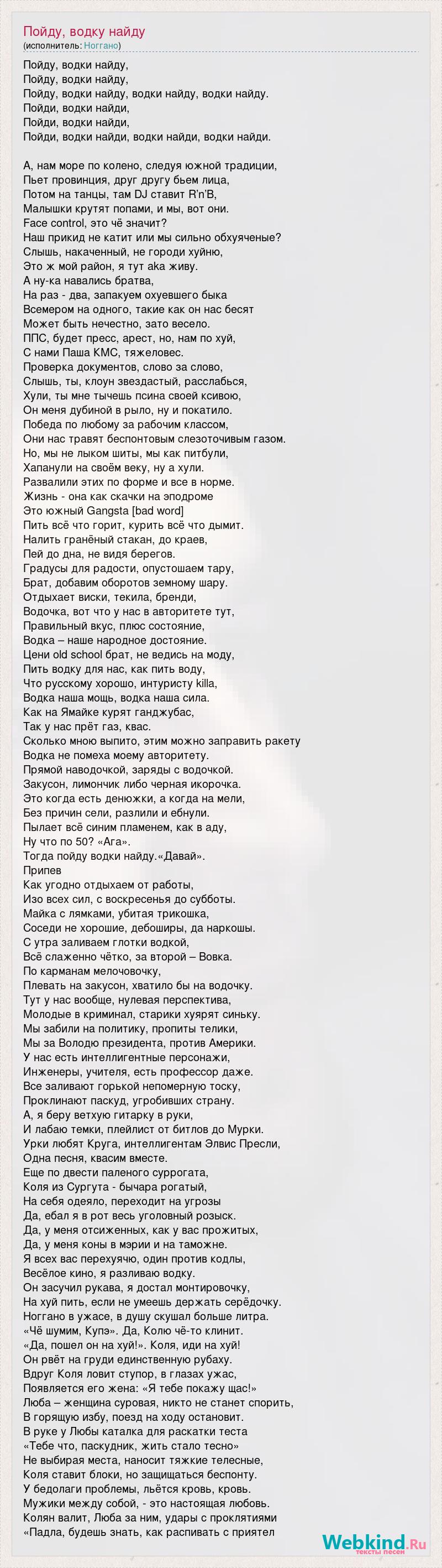 Пойду, водки найду, Пойду, водки найду, Пойду, водки найду, водки найду, водки найду. Пойди, водки найди, Пойди, водки найди, Пойди, водки найди, водки найди, водки найди. А, нам море по колено, следуя южной традиции, Пьет провинция, друг другу бьем лица, Потом на танцы, там DJ ставит R’n’B, Малышки крутят попами, и мы, вот они. Face control, это чё значит? Наш прикид не катит или мы сильно обхуяченые? Слышь, накаченный, не городи хуйню, Это ж мой район, я тут aka живу. А ну-ка навались братва, На раз - два, запакуем охуевшего быка Всемером на одного, такие как он нас бесят Может быть нечестно, зато весело. ППС, будет пресс, арест, но, нам по хуй, С нами Паша КМС, тяжеловес. Проверка документов, слово за слово, Слышь, ты, клоун звездастый, расслабься, Хули, ты мне тычешь псина своей ксивою, Он меня дубиной в рыло, ну и покатило. Победа по любому за рабочим классом, Они нас травят беспонтовым слезоточивым газом. Но, мы не лыком шиты, мы как питбули, Хапанули на своём веку, ну а хули. Развалили этих по форме и все в норме. Жизнь - она как скачки на эподроме Это южный Gangsta [bad word] Пить всё что горит, курить всё что дымит. Налить гранёный стакан, до краев, Пей до дна, не видя берегов. Градусы для радости, опустошаем тару, Брат, добавим оборотов земному шару. Отдыхает виски, текила, бренди, Водочка, вот что у нас в авторитете тут, Правильный вкус, плюс состояние, Водка – наше народное достояние. Цени old school брат, не ведись на моду, Пить водку для нас, как пить воду, Что русскому хорошо, интуристу killa, Водка наша мощь, водка наша сила. Как на Ямайке курят ганджубас, Так у нас прёт газ, квас. Сколько мною выпито, этим можно заправить ракету Водка не помеха моему авторитету. Прямой наводочкой, заряды с водочкой. Закусон, лимончик либо черная икорочка. Это когда есть денюжки, а когда на мели, Без причин сели, разлили и ебнули. Пылает всё синим пламенем, как в аду, Ну что по 50? «Ага». Тогда пойду водки найду.«Давай». Припев Как угодно отдыхаем от работы, Изо всех сил, с воскресенья до субботы. Майка с лямками, убитая трикошка, Соседи не хорошие, дебоширы, да наркошы. С утра заливаем глотки водкой, Всё слаженно чётко, за второй – Вовка. По карманам мелочовочку, Плевать на закусон, хватило бы на водочку. Тут у нас вообще, нулевая перспектива, Молодые в криминал, старики хуярят синьку. Мы забили на политику, пропиты телики, Мы за Володю президента, против Америки. У нас есть интеллигентные персонажи, Инженеры, учителя, есть профессор даже. Все заливают горькой непомерную тоску, Проклинают паскуд, угробивших страну. А, я беру ветхую гитарку в руки, И лабаю темки, плейлист от битлов до Мурки. Урки любят Круга, интеллигентам Элвис Пресли, Одна песня, квасим вместе. Еще по двести паленого суррогата, Коля из Сургута - бычара рогатый, На себя одеяло, переходит на угрозы Да, ебал я в рот весь уголовный розыск. Да, у меня отсиженных, как у вас прожитых, Да, у меня коны в мэрии и на таможне. Я всех вас перехуячю, один против кодлы, Весёлое кино, я разливаю водку. Он засучил рукава, я достал монтировочку, На хуй пить, если не умеешь держать серёдочку. Ноггано в ужасе, в душу скушал больше литра. «Чё шумим, Купэ». Да, Колю чё-то клинит. «Да, пошел он на хуй!». Коля, иди на хуй! Он рвёт на груди единственную рубаху. Вдруг Коля ловит ступор, в глазах ужас, Появляется его жена: «Я тебе покажу щас!» Люба – женщина суровая, никто не станет спорить, В г