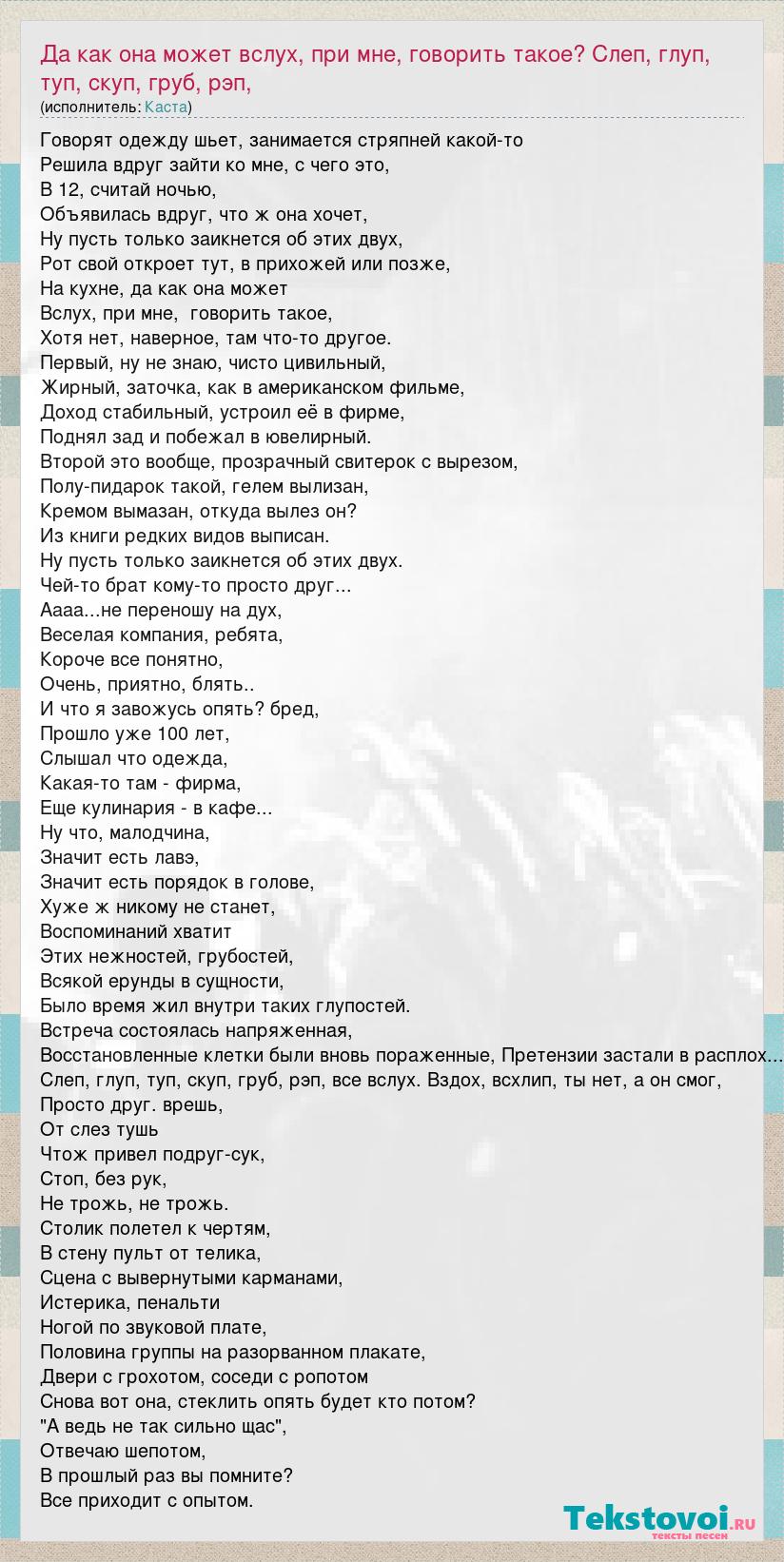 А как ты думаешь, о чем песня "Да как она может вслух, при мне, говорить такое? Слеп, глуп, туп, скуп, г" ?