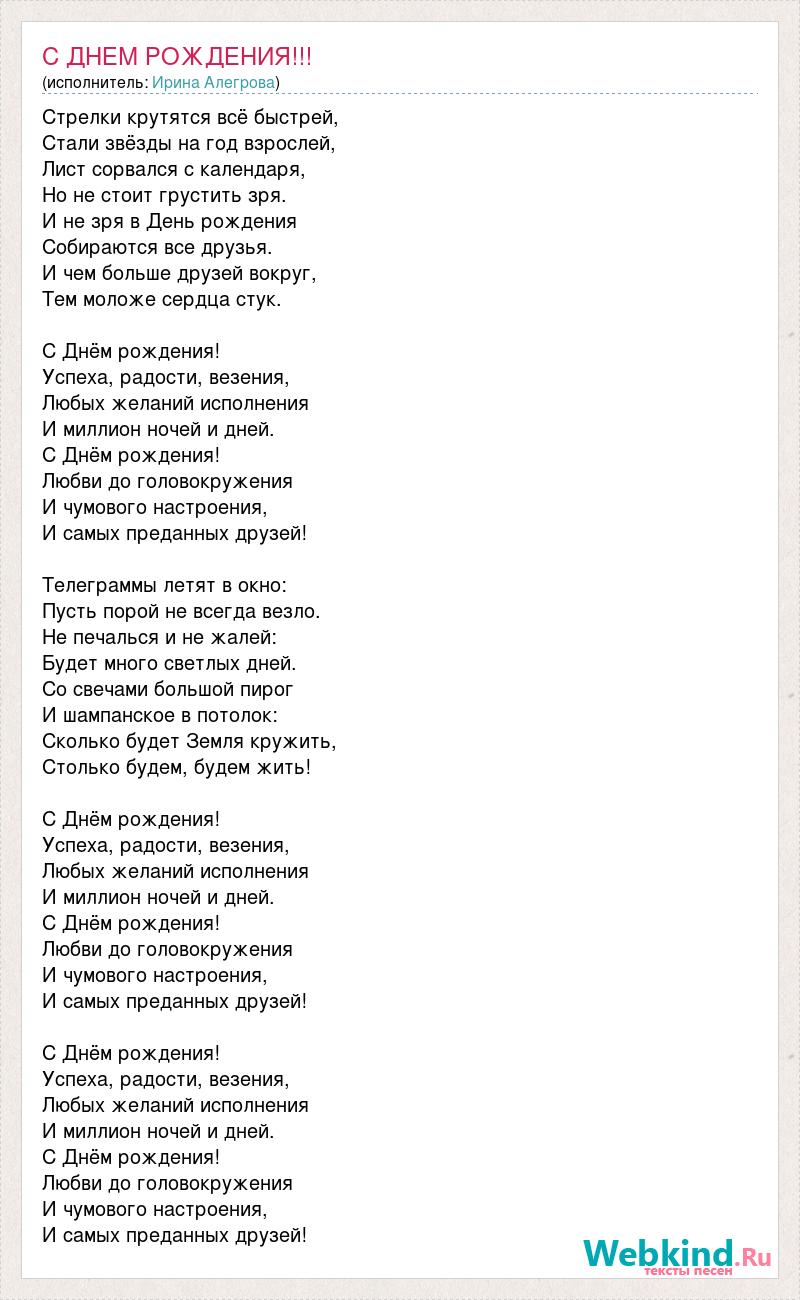 Стрелки крутятся всё быстрей, Стали звёзды на год взрослей, Лист сорвался с календаря, Но не стоит грустить зря. И не зря в День рождения Собираются все друзья. И чем больше друзей вокруг, Тем моложе сердца стук. С Днём рождения! Успеха, радости, везения, Любых желаний исполнения И миллион ночей и дней. С Днём рождения! Любви до головокружения И чумового настроения, И самых преданных друзей! Телеграммы летят в окно: Пусть порой не всегда везло. Не печалься и не жалей: Будет много светлых дней. Со свечами большой пирог И шампанское в потолок: Сколько будет Земля кружить, Столько будем, будем жить! С Днём рождения! Успеха, радости, везения, Любых желаний исполнения И миллион ночей и дней. С Днём рождения! Любви до головокружения И чумового настроения, И самых преданных друзей! С Днём рождения! Успеха, радости, везения, Любых желаний исполнения И миллион ночей и дней. С Днём рождения! Любви до головокружения И чумового настроения, И самых преданных друзей!