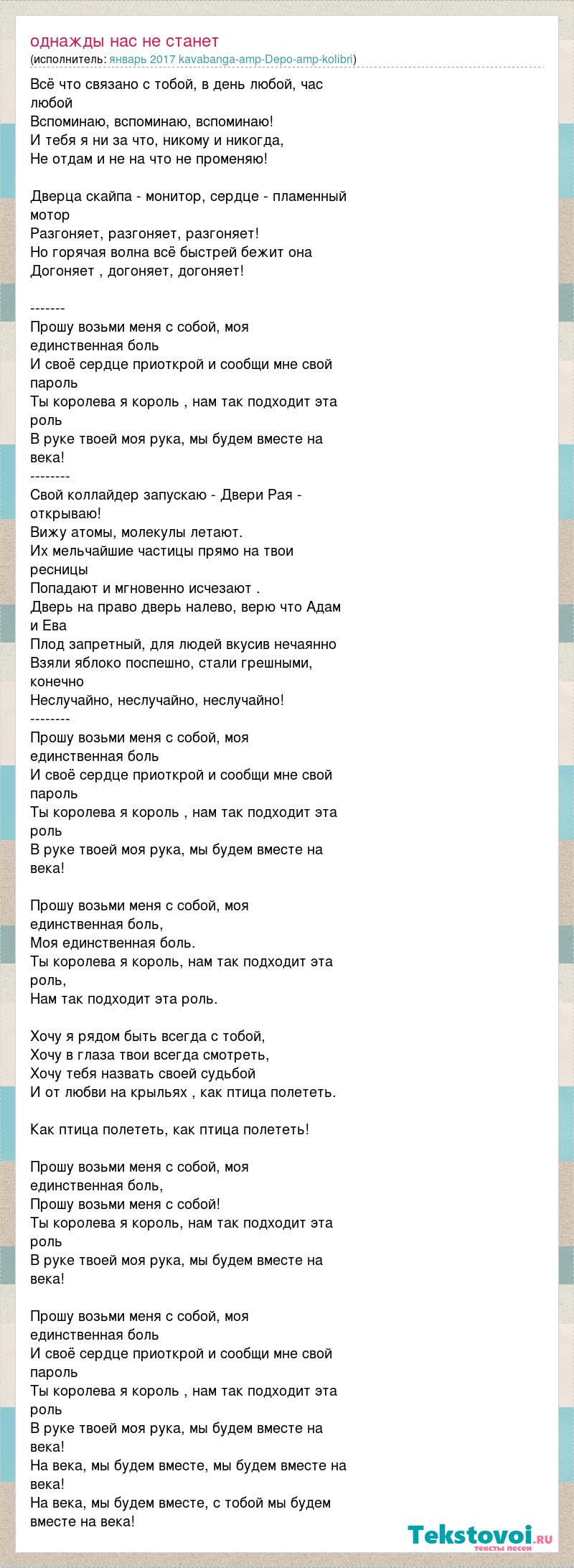 Всё что связано с тобой, в день любой, час любой Вспоминаю, вспоминаю, вспоминаю! И тебя я ни за что, никому и никогда, Не отдам и не на что не променяю! Дверца скайпа - монитор, сердце - пламенный мотор Разгоняет, разгоняет, разгоняет! Но горячая волна всё быстрей бежит она Догоняет , догоняет, догоняет! ------- Прошу возьми меня с собой, моя единственная боль И своё сердце приоткрой и сообщи мне свой пароль Ты королева я король , нам так подходит эта роль В руке твоей моя рука, мы будем вместе на века! -------- Свой коллайдер запускаю - Двери Рая - открываю! Вижу атомы, молекулы летают. Их мельчайшие частицы прямо на твои ресницы Попадают и мгновенно исчезают . Дверь на право дверь налево, верю что Адам и Ева Плод запретный, для людей вкусив нечаянно Взяли яблоко поспешно, стали грешными, конечно Неслучайно, неслучайно, неслучайно! -------- Прошу возьми меня с собой, моя единственная боль И своё сердце приоткрой и сообщи мне свой пароль Ты королева я король , нам так подходит эта роль В руке твоей моя рука, мы будем вместе на века! Прошу возьми меня с собой, моя единственная боль, Моя единственная боль. Ты королева я король, нам так подходит эта роль, Нам так подходит эта роль. Хочу я рядом быть всегда с тобой, Хочу в глаза твои всегда смотреть, Хочу тебя назвать своей судьбой И от любви на крыльях , как птица полететь. Как птица полететь, как птица полететь! Прошу возьми меня с собой, моя единственная боль, Прошу возьми меня с собой! Ты королева я король, нам так подходит эта роль В руке твоей моя рука, мы будем вместе на века! Прошу возьми меня с собой, моя единственная боль И своё сердце приоткрой и сообщи мне свой пароль Ты королева я король , нам так подходит эта роль В руке твоей моя рука, мы будем вместе на века! На века, мы будем вместе, мы будем вместе на века! На века, мы будем вместе, с тобой мы будем вместе на века!