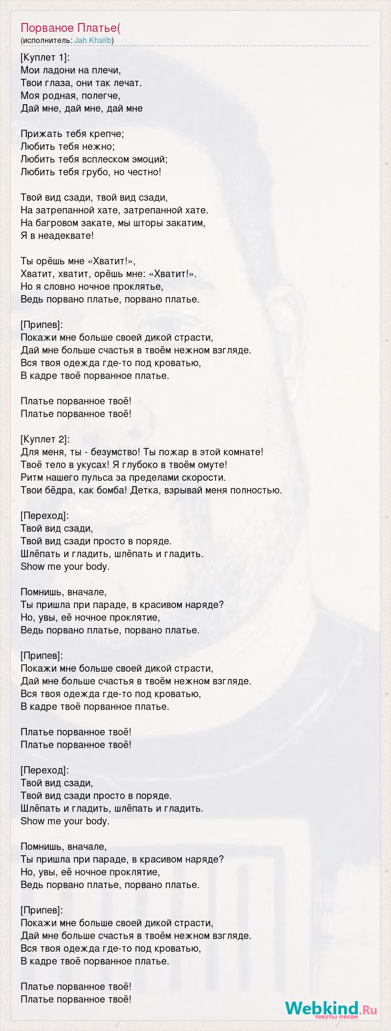 [Куплет 1]: Мои ладони на плечи, Твои глаза, они так лечат. Моя родная, полегче, Дай мне, дай мне, дай мне Прижать тебя крепче; Любить тебя нежно; Любить тебя всплеском эмоций; Любить тебя грубо, но честно! Твой вид сзади, твой вид сзади, На затрепанной хате, затрепанной хате. На багровом закате, мы шторы закатим, Я в неадеквате! Ты орёшь мне «Хватит!», Хватит, хватит, орёшь мне: «Хватит!». Но я словно ночное проклятье, Ведь порвано платье, порвано платье. [Припев]: Покажи мне больше своей дикой страсти, Дай мне больше счастья в твоём нежном взгляде. Вся твоя одежда где-то под кроватью, В кадре твоё порванное платье. Платье порванное твоё! Платье порванное твоё! [Куплет 2]: Для меня, ты - безумство! Ты пожар в этой комнате! Твоё тело в укусах! Я глубоко в твоём омуте! Ритм нашего пульса за пределами скорости. Твои бёдра, как бомба! Детка, взрывай меня полностью. [Переход]: Твой вид сзади, Твой вид сзади просто в поряде. Шлёпать и гладить, шлёпать и гладить. Show me your body. Помнишь, вначале, Ты пришла при параде, в красивом наряде? Но, увы, её ночное проклятие, Ведь порвано платье, порвано платье. [Припев]: Покажи мне больше своей дикой страсти, Дай мне больше счастья в твоём нежном взгляде. Вся твоя одежда где-то под кроватью, В кадре твоё порванное платье. Платье порванное твоё! Платье порванное твоё! [Переход]: Твой вид сзади, Твой вид сзади просто в поряде. Шлёпать и гладить, шлёпать и гладить. Show me your body. Помнишь, вначале, Ты пришла при параде, в красивом наряде? Но, увы, её ночное проклятие, Ведь порвано платье, порвано платье. [Припев]: Покажи мне больше своей дикой страсти, Дай мне больше счастья в твоём нежном взгляде. Вся твоя одежда где-то под кроватью, В кадре твоё порванное платье. Платье порванное твоё! Платье порванное твоё!
