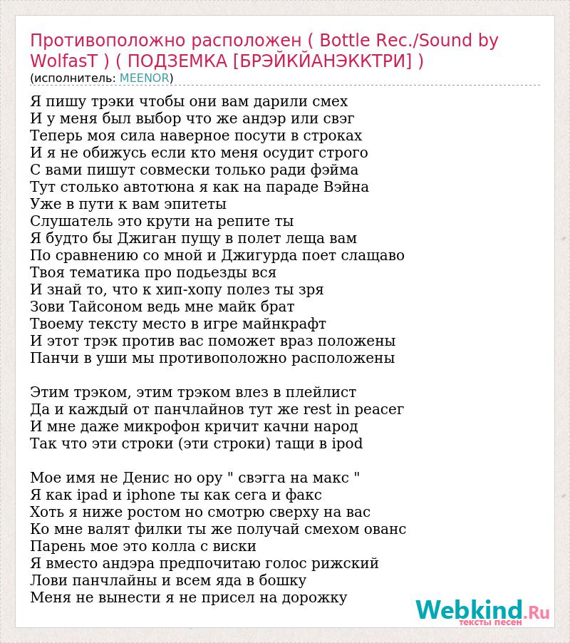 А как ты думаешь, о чем песня "Противоположно расположен ( Bottle Rec./Sound by WolfasT ) ( ПОДЗЕМКА [Б" ?