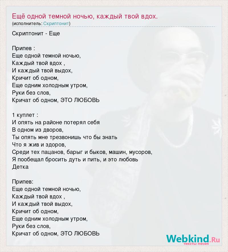 Скриптонит - Еще Припев : Еще одной темной ночью, Каждый твой вдох , И каждый твой выдох, Кричит об одном, Еще одним холодным утром, Руки без слов, Кричат об одном, ЭТО ЛЮБОВЬ 1 куплет : И опять на районе потерял себя В одном из дворов, Ты опять мне трезвонишь что бы знать Что я жив и здоров, Среди тех пацанов, барыг и быков, машин, мусоров, Я пообещал бросить дуть и пить, и это любовь Детка Припев: Еще одной темной ночью, Каждый твой вдох , И каждый твой выдох, Кричит об одном, Еще одним холодным утром, Руки без слов, Кричат об одном, ЭТО ЛЮБОВЬ