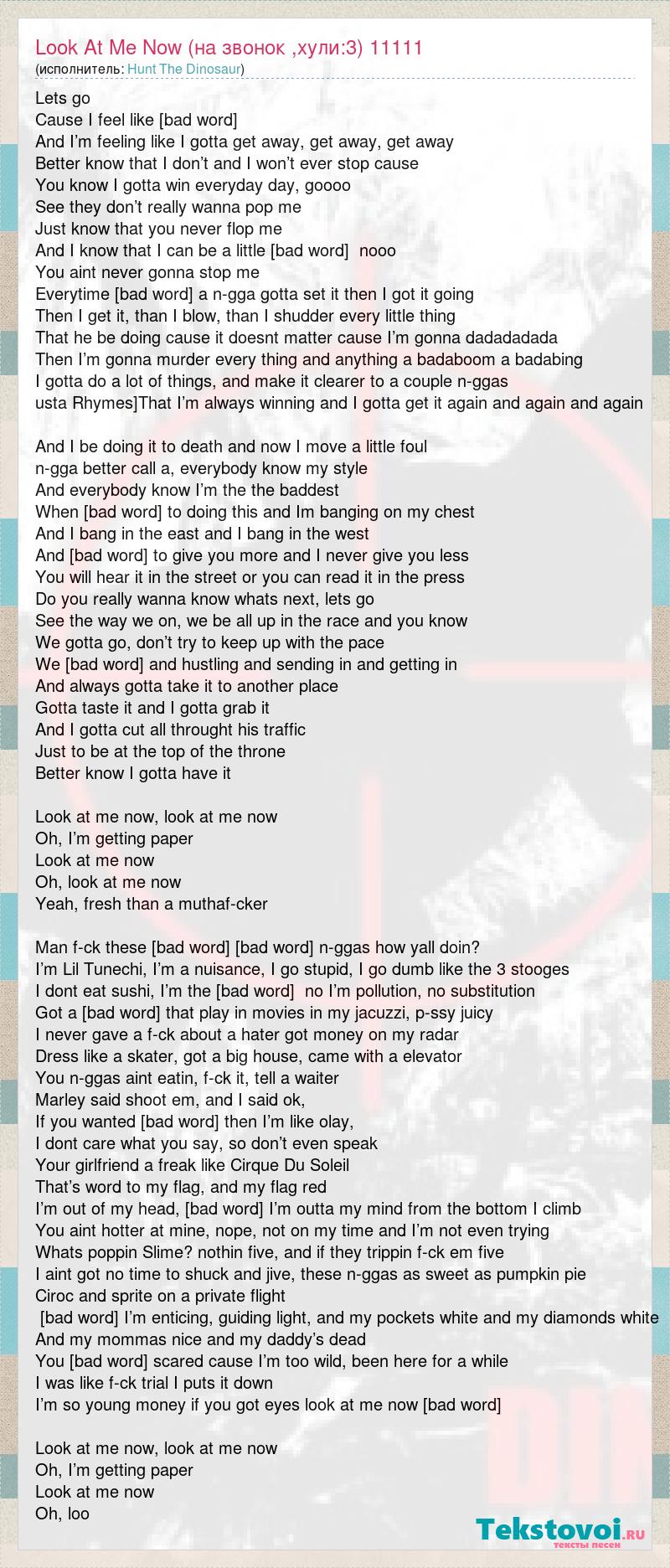 Lets go Cause I feel like [bad word] And I’m feeling like I gotta get away, get away, get away Better know that I don’t and I won’t ever stop cause You know I gotta win everyday day, goooo See they don’t really wanna pop me Just know that you never flop me And I know that I can be a little [bad word] nooo You aint never gonna stop me Everytime [bad word] a n-gga gotta set it then I got it going Then I get it, than I blow, than I shudder every little thing That he be doing cause it doesnt matter cause I’m gonna dadadadada Then I’m gonna murder every thing and anything a badaboom a badabing I gotta do a lot of things, and make it clearer to a couple n-ggas usta Rhymes]That I’m always winning and I gotta get it again and again and again And I be doing it to death and now I move a little foul n-gga better call a, everybody know my style And everybody know I’m the the baddest When [bad word] to doing this and Im banging on my chest And I bang in the east and I bang in the west And [bad word] to give you more and I never give you less You will hear it in the street or you can read it in the press Do you really wanna know whats next, lets go See the way we on, we be all up in the race and you know We gotta go, don’t try to keep up with the pace We [bad word] and hustling and sending in and getting in And always gotta take it to another place Gotta taste it and I gotta grab it And I gotta cut all throught his traffic Just to be at the top of the throne Better know I gotta have it Look at me now, look at me now Oh, I’m getting paper Look at me now Oh, look at me now Yeah, fresh than a muthaf-cker Man f-ck these [bad word] [bad word] n-ggas how yall doin? I’m Lil Tunechi, I’m a nuisance, I go stupid, I go dumb like the 3 stooges I dont eat sushi, I’m the [bad word] no I’m pollution, no substitution Got a [bad word] that play in movies in my jacuzzi, p-ssy juicy I never gave a f-ck about a hater got money on my radar Dress like a skater, got a big house, came with a elevator You n-ggas aint eatin, f-ck it, tell a waiter Marley said shoot em, and I said ok, If you wanted [bad word] then I’m like olay, I dont care what you say, so don’t even speak Your girlfriend a freak like Cirque Du Soleil That’s word to my flag, and my flag red I’m out of my head, [bad word] I’m outta my mind from the bottom I climb You aint hotter at mine, nope, not on my time and I’m not even trying Whats poppin Slime? nothin five, and if they trippin f-ck em five I aint got no time to shuck and jive, these n-ggas as sweet as pumpkin pie Ciroc and sprite on a private flight [bad word] I’m enticing, guiding light, and my pockets white and my diamonds white And my mommas nice and my daddy’s dead You [bad word] scared cause I’m too wild, been here for a while I was like f-ck trial I puts it down I’m so young money if you got eyes look at me now [bad word] Look at me now, look at me now Oh, I’m getting paper Look at me now Oh, loo