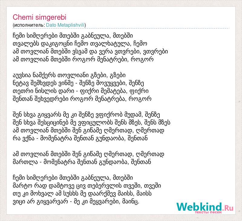 ჩემი სიმღერები მთებში გაბნეულა, მთებში თვალებს დაკიგოცნი ჩემო თვალხატულა, ჩემო ამ თოვლიან მთებში ვსვამ და ვერა ვთვრები, ვთვრები ამ თოვლიან მთებში როგორ მენატრები, როგორ აუვსია ნამქერს თოვლიანი გზები, გზები ნეტავ შემხვდეს ვინმე - შენზე მოვუყვები, შენზე თეთრი ნისლის დარი - ფიქრი მემატება, ფიქრი შენთან შეხვედრები როგორ მენატრება, როგორ შენ სხვა გიყვარს მე კი შენზე ვფიქრობ მუდამ, შენზე შენ სხვა შესციცინებ მე ვფიცულობს შენს მზეს, შენს მზეს ამ თოვლიან მთებში შენ გიწამე ღმერთად, ღმერთად რა ვქნა - მომენატრა შენთან გუნდაობა, შენთან ამ თოვლიან მთებში შენ გიწამე ღმერთად, ღმერთად მართლა - მომენატრა შენთან გუნდაობა, შენთან ჩემი სიმღერები მთებში გაბნეულა, მთებში მარტო რად დამტოვე ცივ თებერვლის თვეში, თვეში თუ კი მოხვალ ამ სუსხს მე დაარქმევ მაისს, მაისს ვიცი არ გიყვარვარ - მე კი მეყვარები, მაინც.