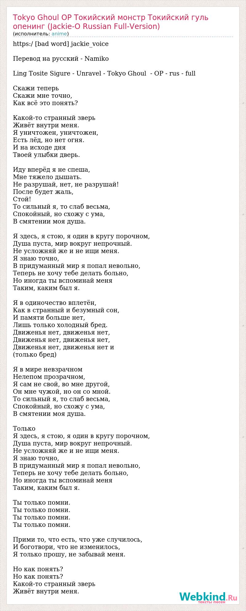 https:/ [bad word] jackie_voice Перевод на русский - Namiko Ling Tosite Sigure - Unravel - Tokyo Ghoul - OP - rus - full Скажи теперь Скажи мне точно, Как всё это понять? Какой-то странный зверь Живёт внутри меня. Я уничтожен, уничтожен, Есть лёд, но нет огня. И на исходе дня Твоей улыбки дверь. Иду вперёд я не спеша, Мне тяжело дышать. Не разрушай, нет, не разрушай! После будет жаль, Стой! То сильный я, то слаб весьма, Спокойный, но схожу с ума, В смятении моя душа. Я здесь, я стою, я один в кругу порочном, Душа пуста, мир вокруг непрочный. Не усложняй же и не ищи меня. Я знаю точно, В придуманный мир я попал невольно, Теперь не хочу тебе делать больно, Но иногда ты вспоминай меня Таким, каким был я. Я в одиночество вплетён, Как в странный и безумный сон, И памяти больше нет, Лишь только холодный бред. Движенья нет, движенья нет, Движенья нет, движенья нет, Движенья нет, движенья нет и (только бред) Я в мире невзрачном Нелепом прозрачном, Я сам не свой, во мне другой, Он мне чужой, но он со мной. То сильный я, то слаб весьма, Спокойный, но схожу с ума, В смятении моя душа. Только Я здесь, я стою, я один в кругу порочном, Душа пуста, мир вокруг непрочный. Не усложняй же и не ищи меня. Я знаю точно, В придуманный мир я попал невольно, Теперь не хочу тебе делать больно, Но иногда ты вспоминай меня Таким, каким был я. Ты только помни. Ты только помни. Ты только помни. Ты только помни. Прими то, что есть, что уже случилось, И боготвори, что не изменилось, Я только прошу, не забывай меня. Но как понять? Но как понять? Какой-то странный зверь Живёт внутри меня.