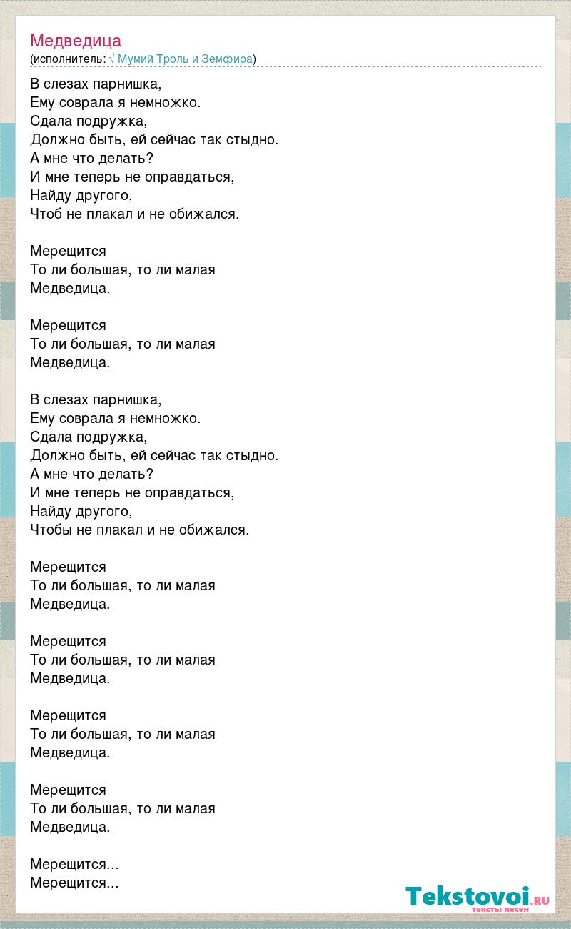 В слезах парнишка, Ему соврала я немножко. Сдала подружка, Должно быть, ей сейчас так стыдно. А мне что делать? И мне теперь не оправдаться, Найду другого, Чтоб не плакал и не обижался. Мерещится То ли большая, то ли малая Медведица. Мерещится То ли большая, то ли малая Медведица. В слезах парнишка, Ему соврала я немножко. Сдала подружка, Должно быть, ей сейчас так стыдно. А мне что делать? И мне теперь не оправдаться, Найду другого, Чтобы не плакал и не обижался. Мерещится То ли большая, то ли малая Медведица. Мерещится То ли большая, то ли малая Медведица. Мерещится То ли большая, то ли малая Медведица. Мерещится То ли большая, то ли малая Медведица. Мерещится... Мерещится...